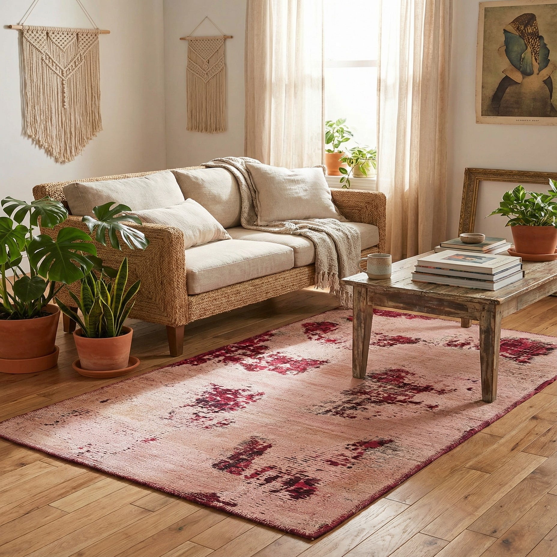 Primary color is Pink. Colors in this rug include: Pink, Black, Burgundy, Red.