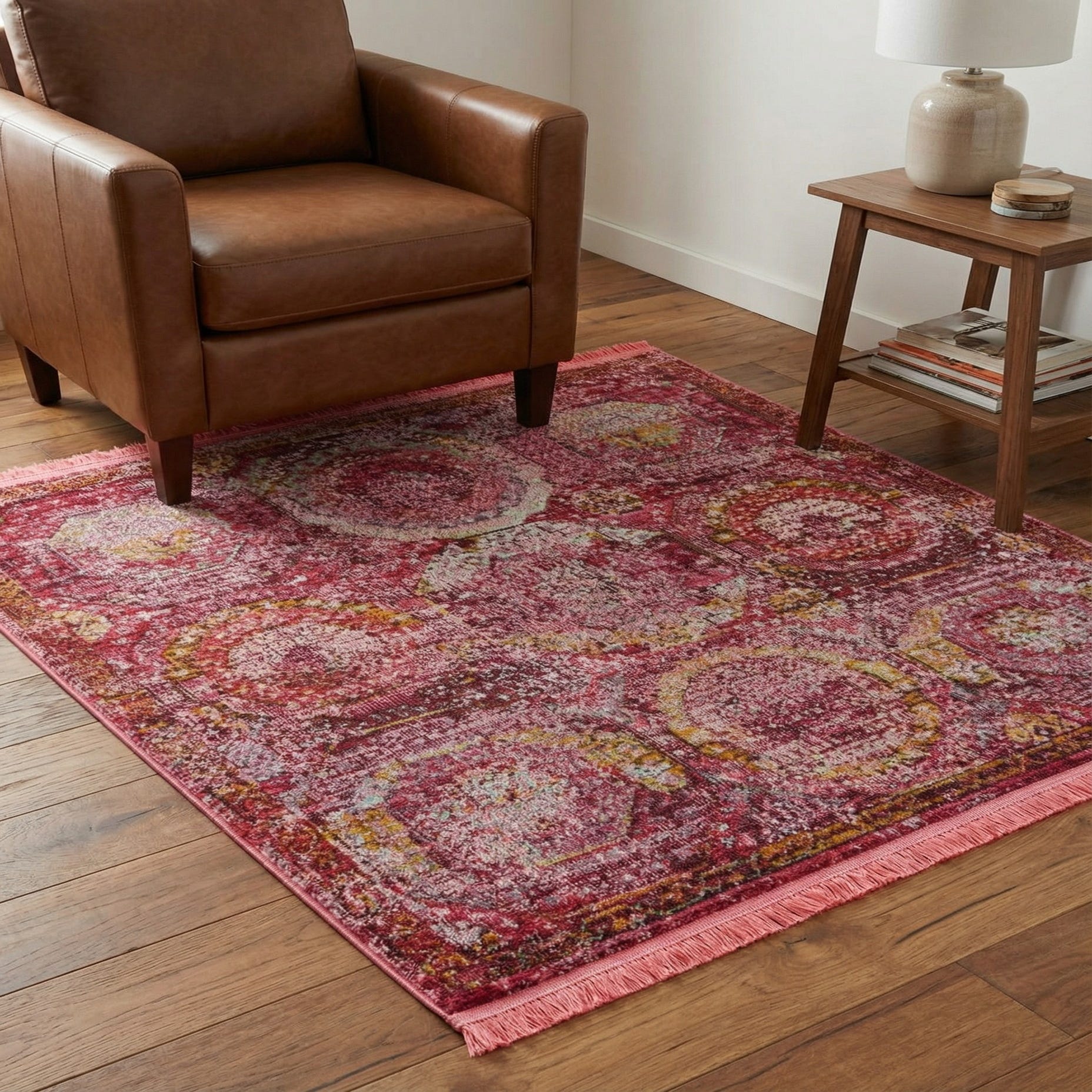 Primary color is Pink. Colors in this rug include: Pink, Burgundy, Olive, Orange, Ivory, Purple, Red.
