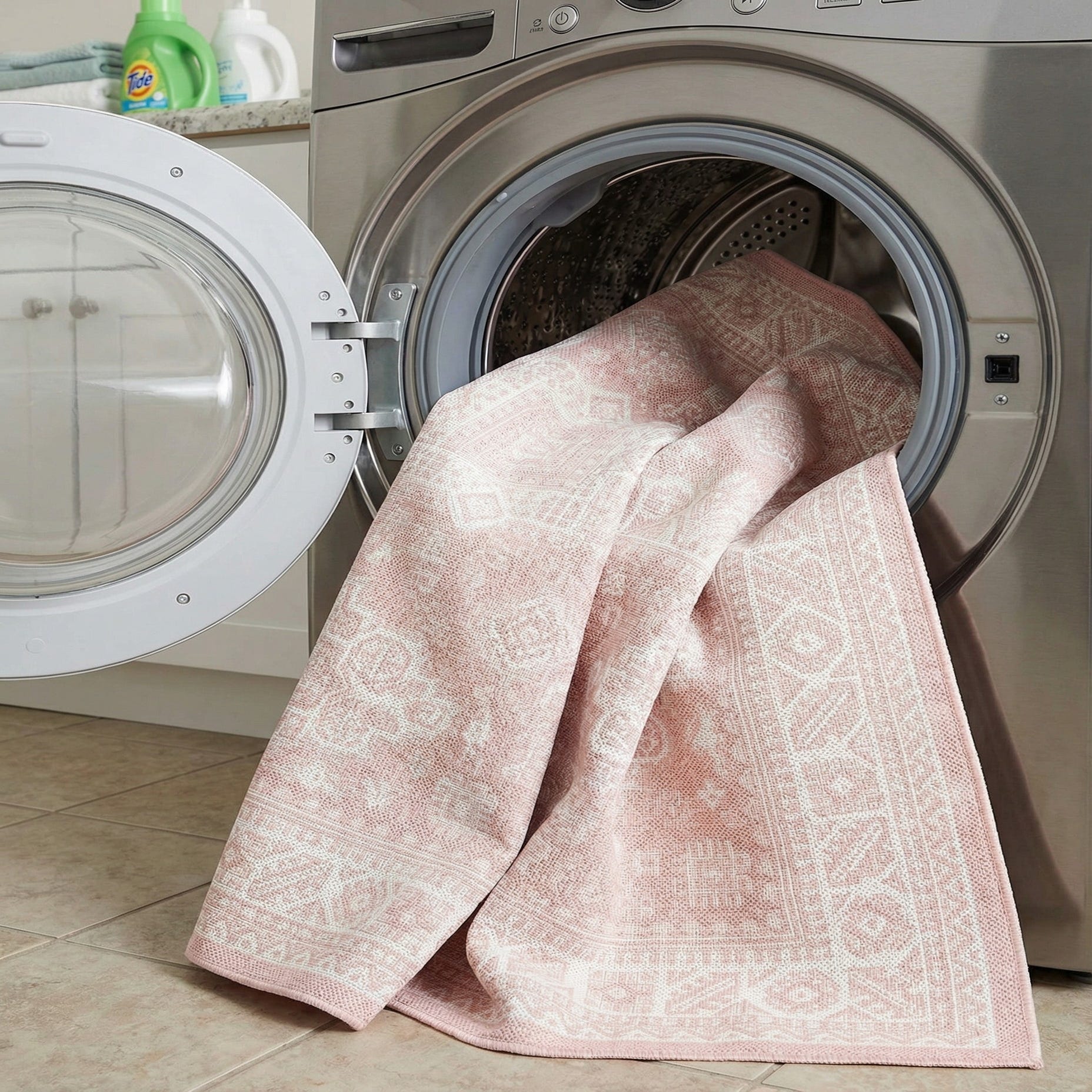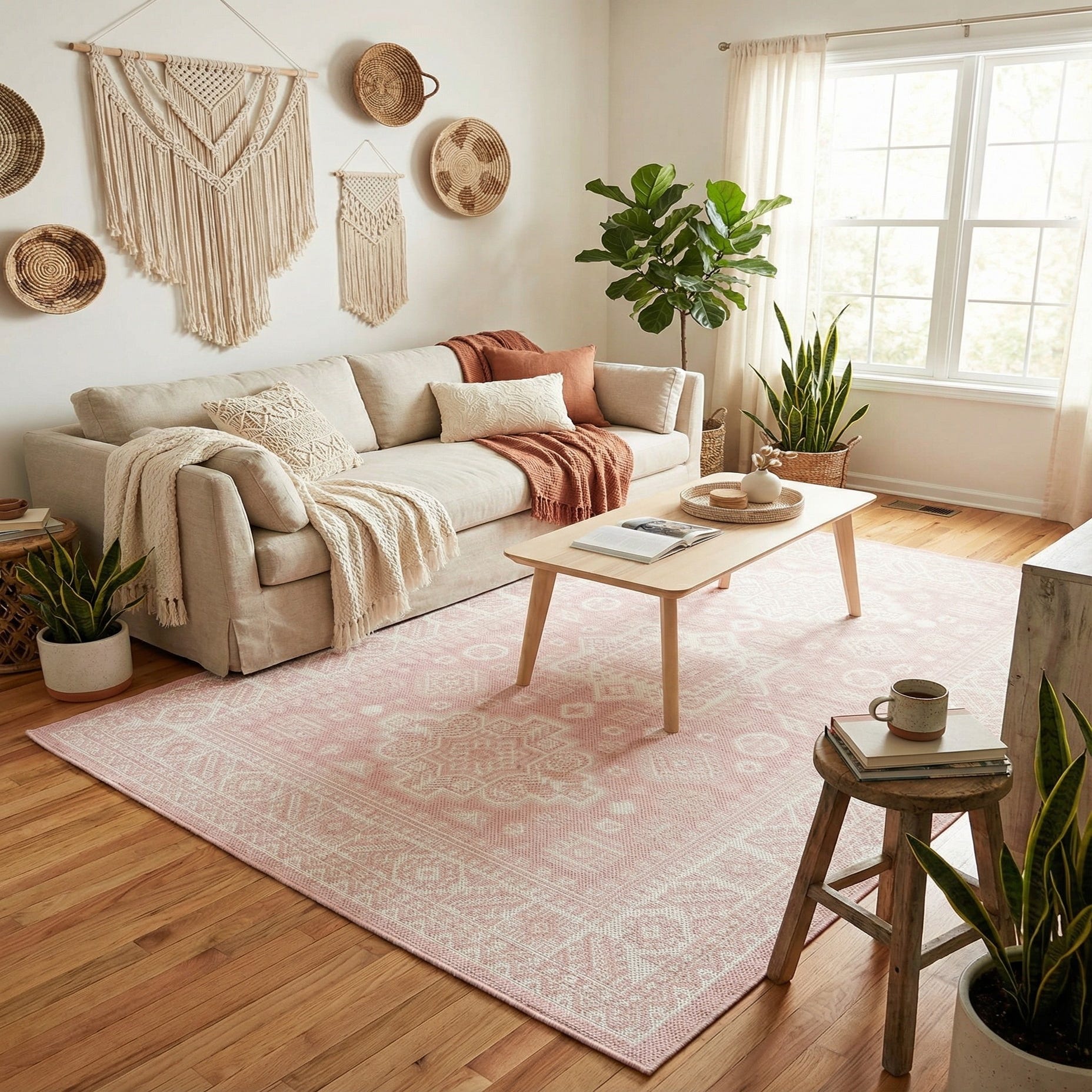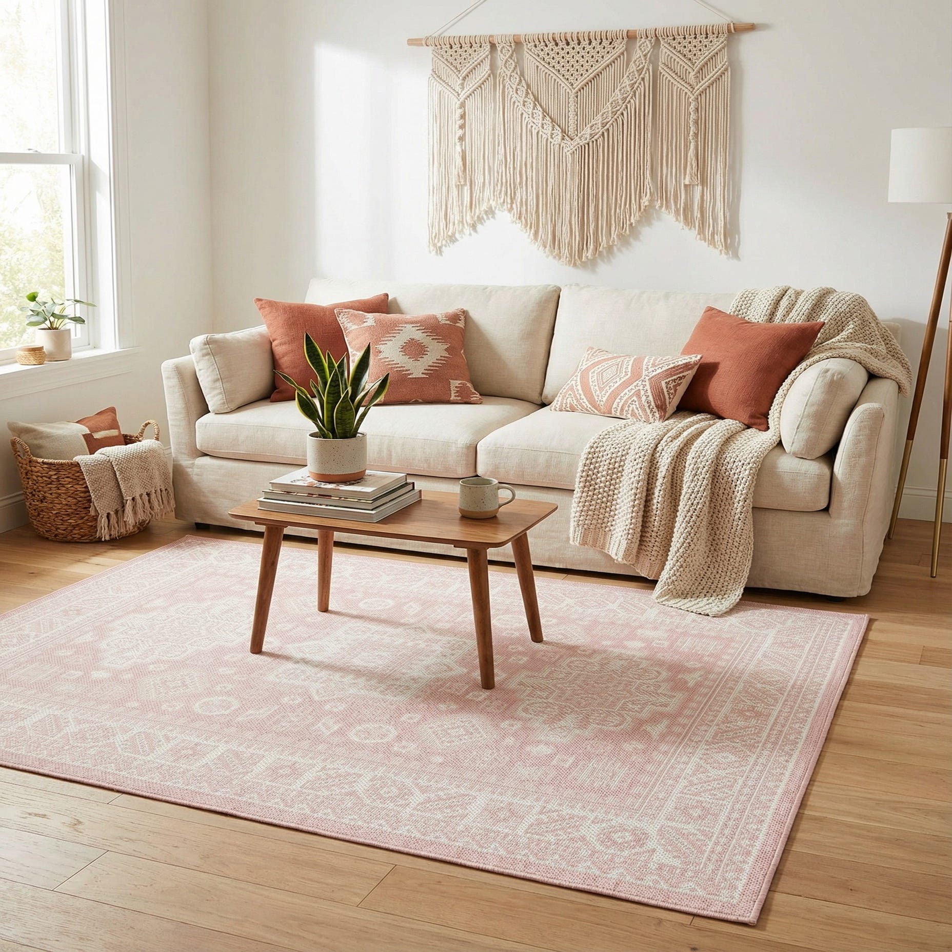 Primary color is Pink. Colors in this rug include: Pink, Ivory.