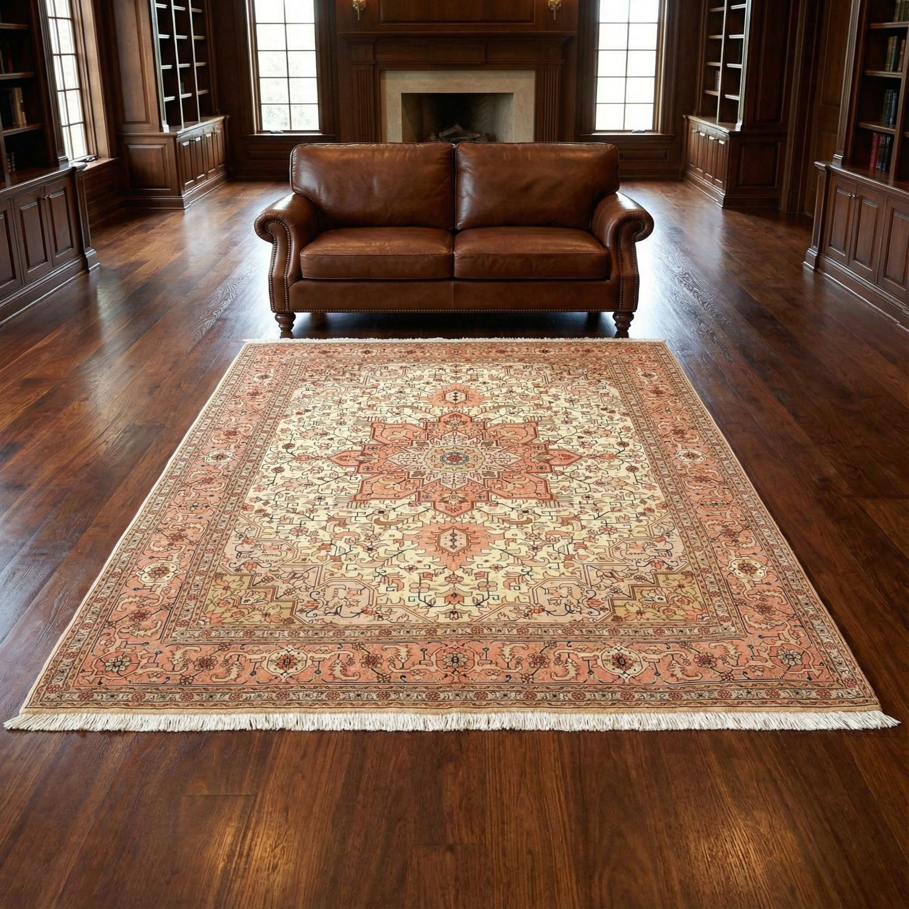 Primary color is Pink. Colors in this rug include: Pink, Pink, Cream, Olive, Purple, Black, Red, Green.