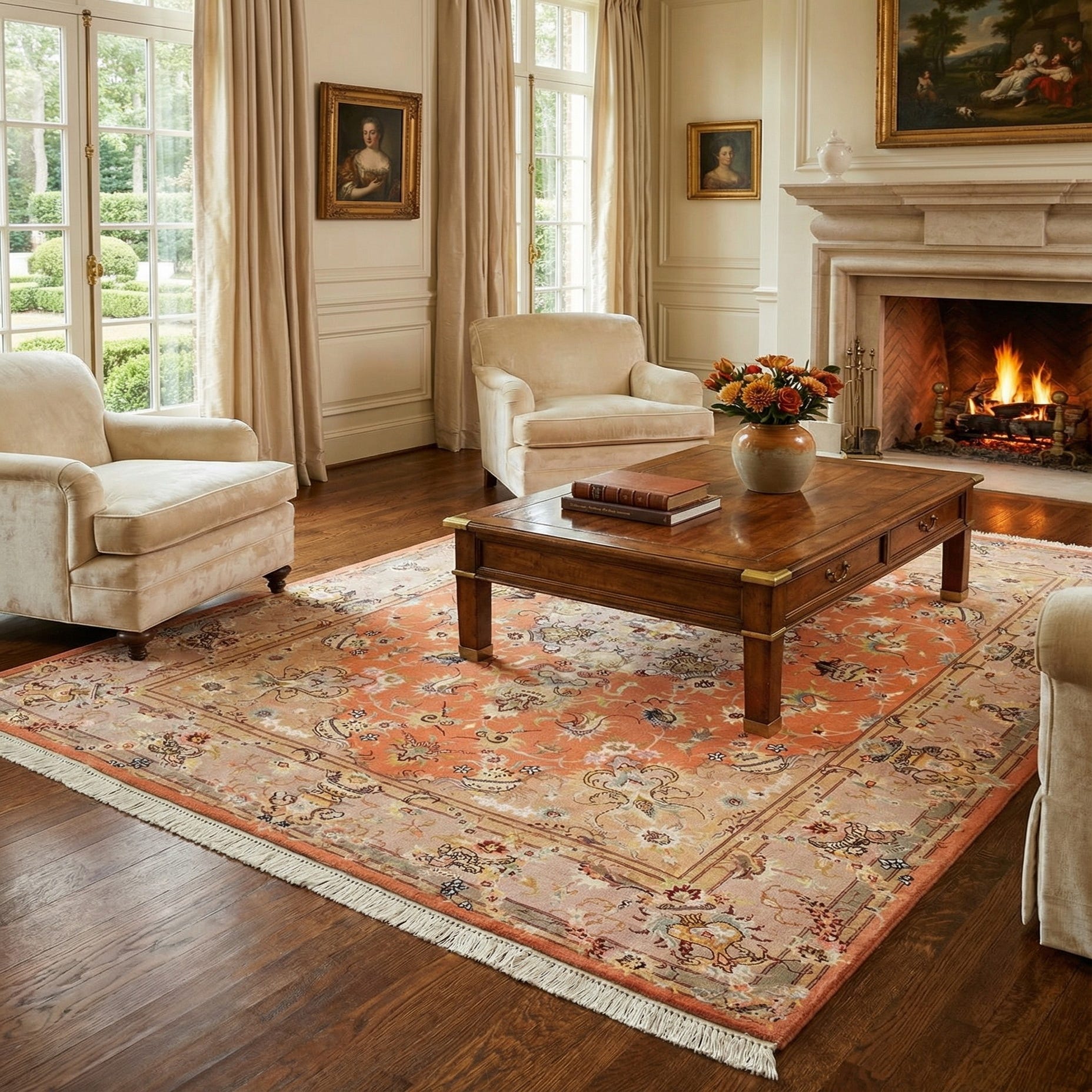Primary color is Pink. Colors in this rug include: Pink, Beige.