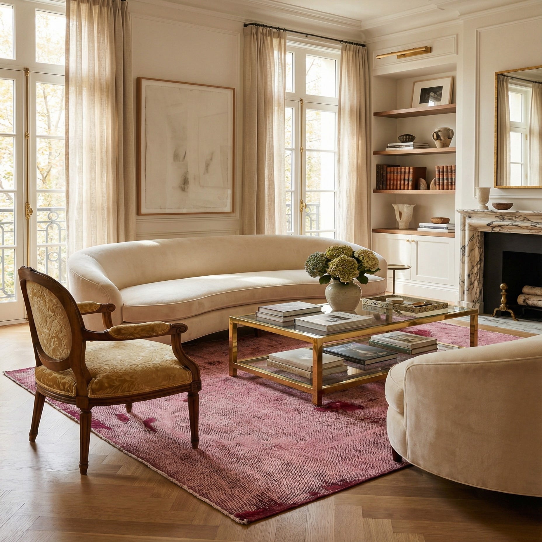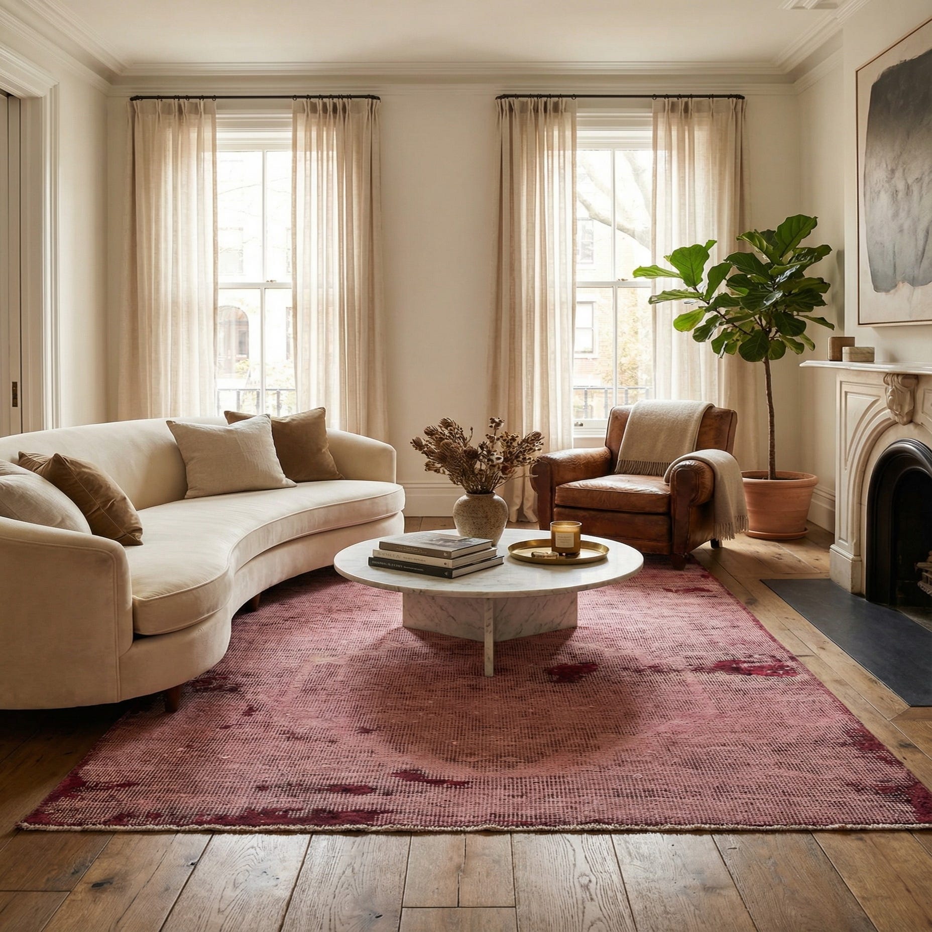 Primary color is Pink. Colors in this rug include: Pink, Brown, Burgundy, Red.