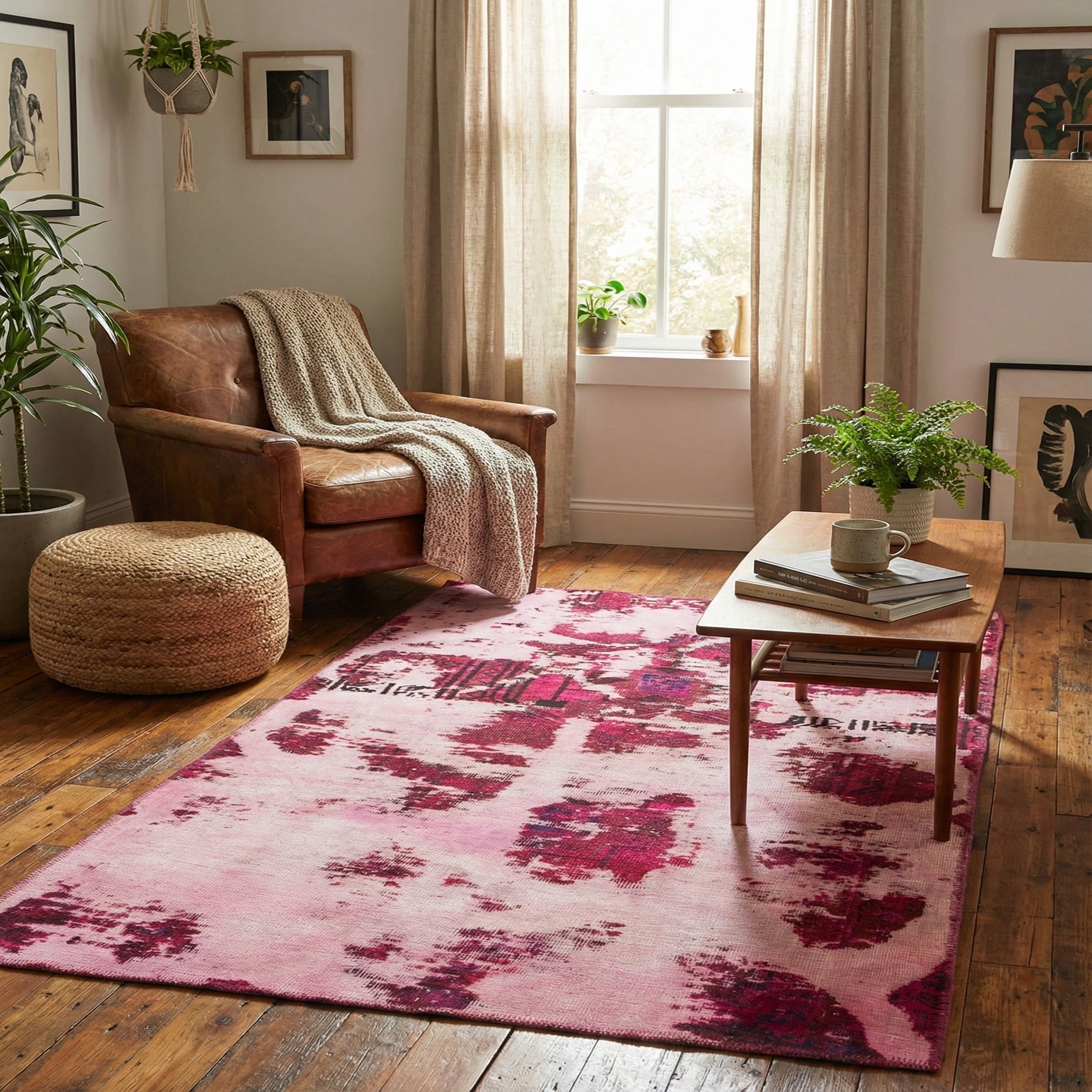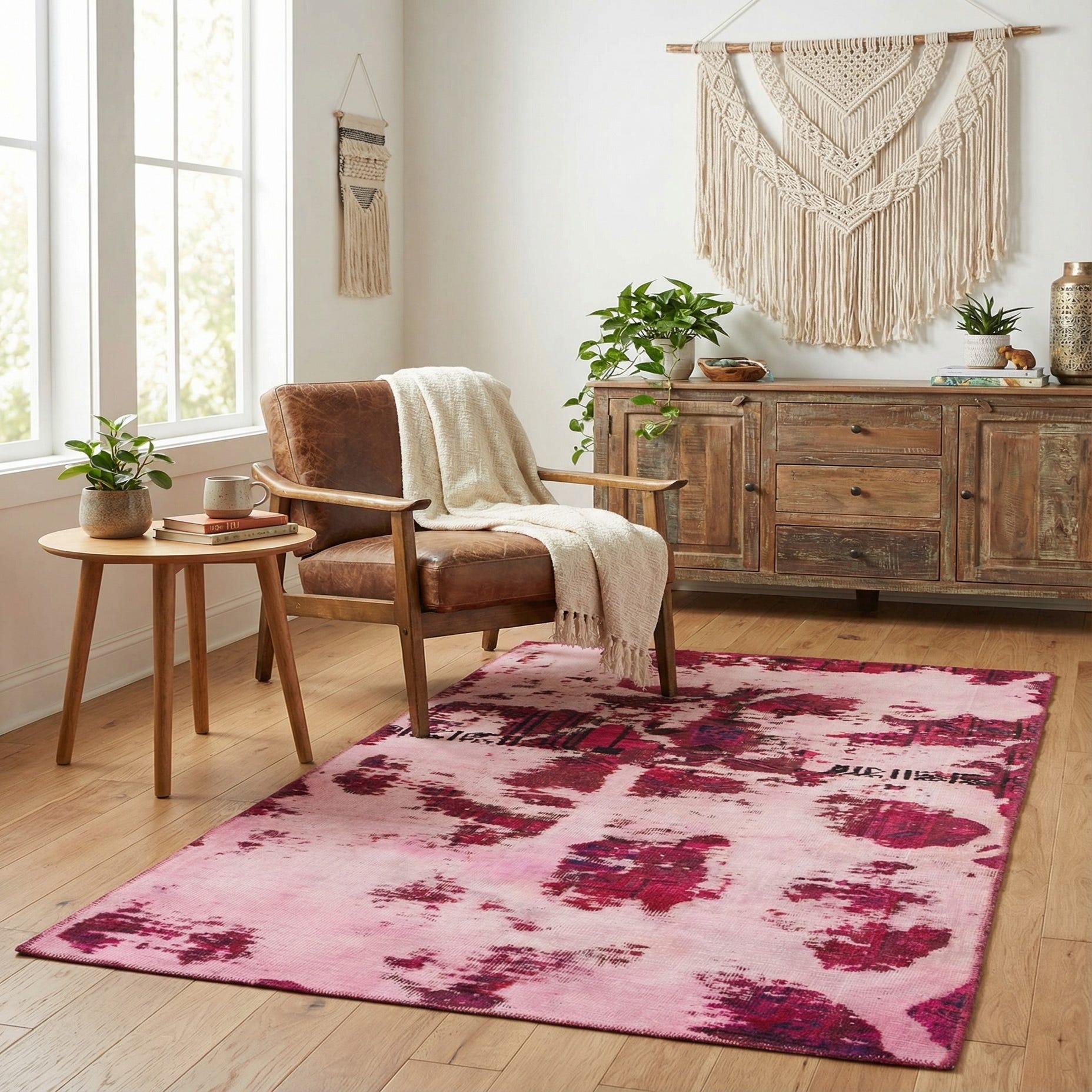 Primary color is Pink. Colors in this rug include: Pink, Black, Red, Puce, Burgundy.