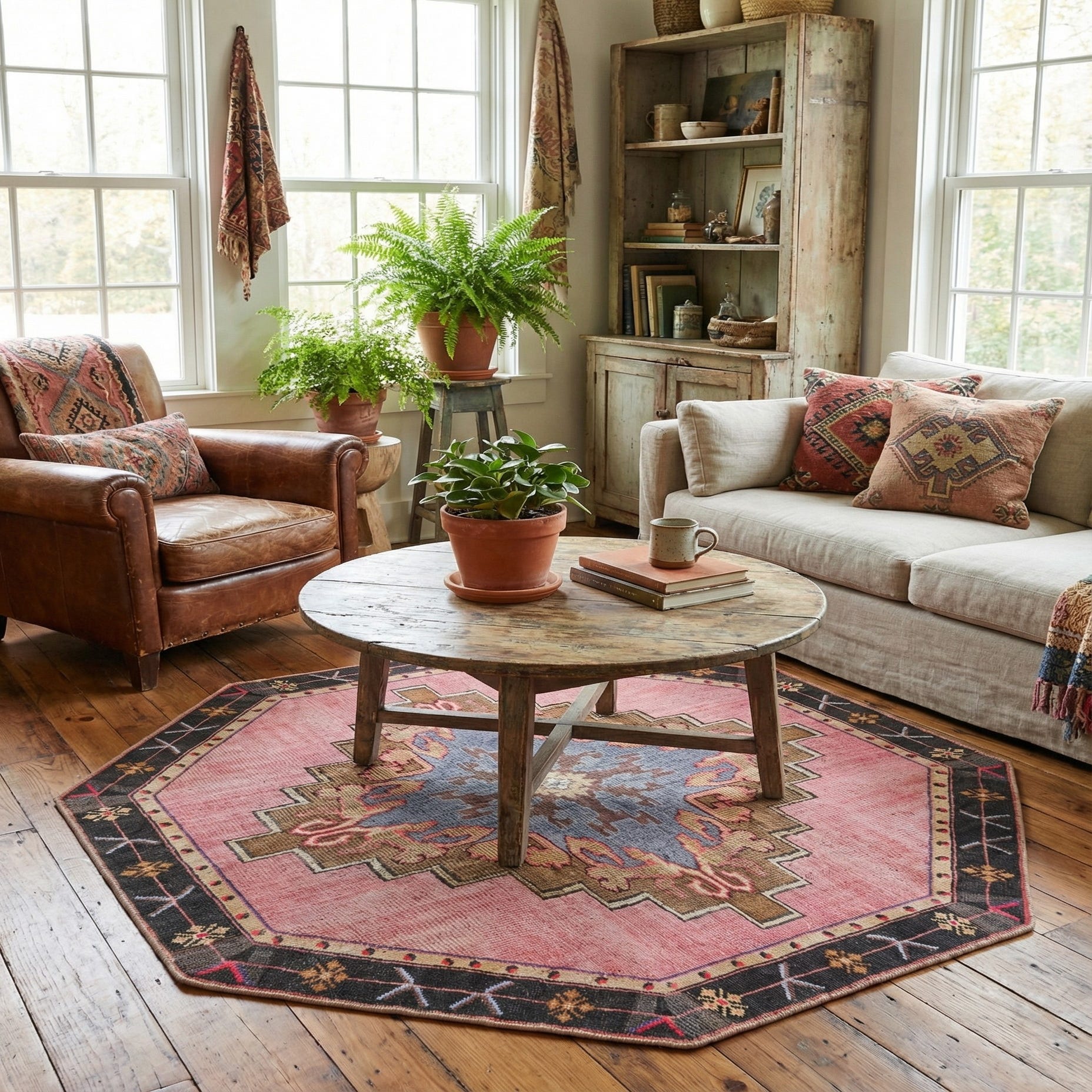 Primary color is Pink. Colors in this rug include: Pink, Beige, Black, Blue, Brown, Olive, Red, Purple.