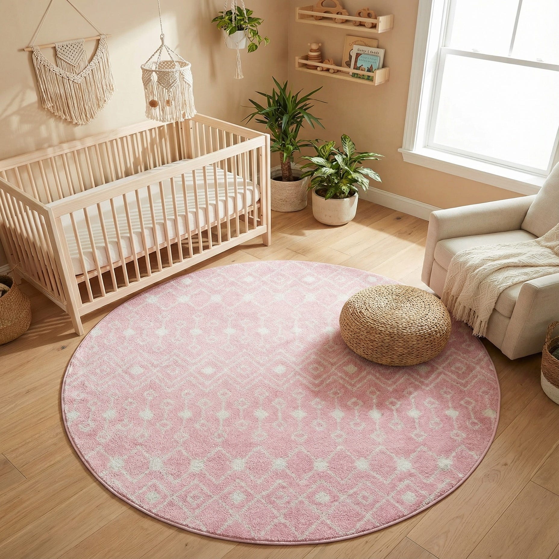 Primary color is Pink. Colors in this rug include: Pink, Ivory.