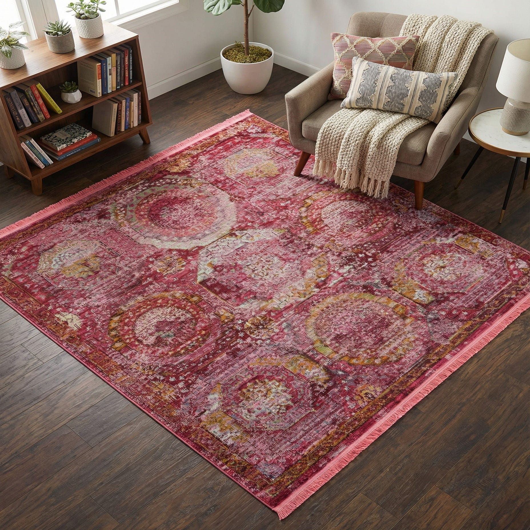 Primary color is Pink. Colors in this rug include: Pink, Burgundy, Ivory, Olive, Orange, Red, Purple.