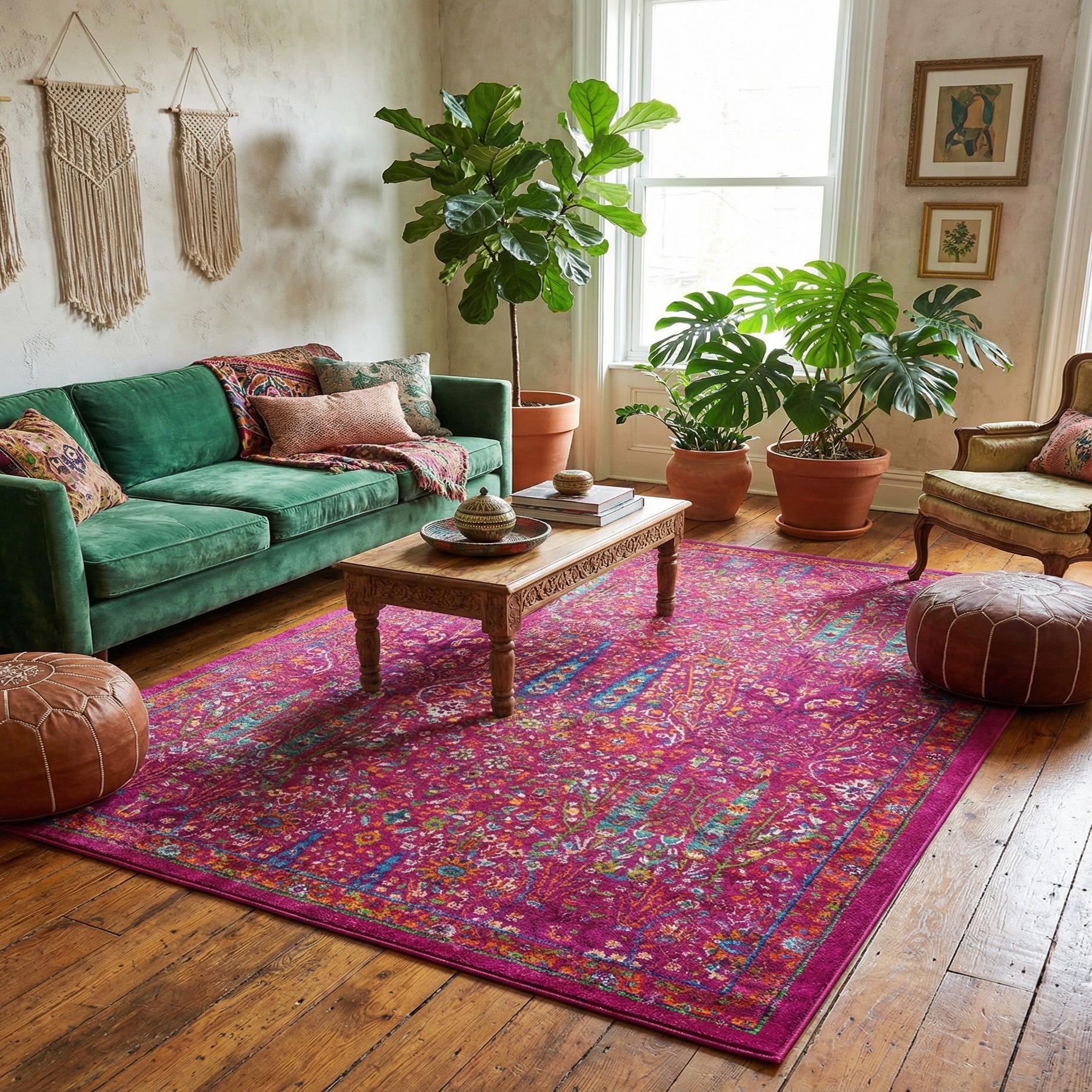 Primary color is Pink. Colors in this rug include: Pink, Blue, Ivory, Navy Blue, Orange, Green.