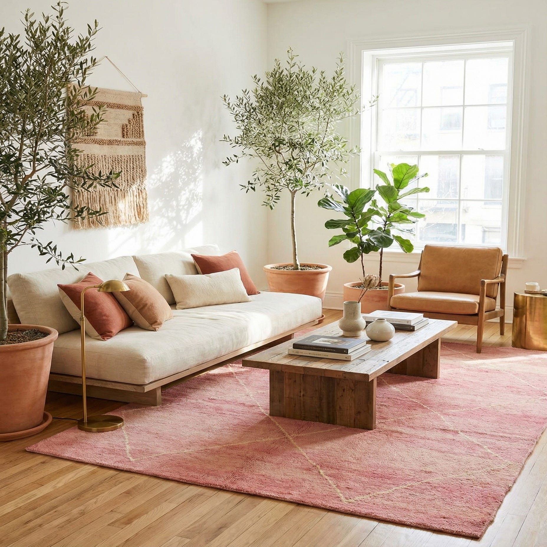 Primary color is Pink. Colors in this rug include: Pink, Ivory.