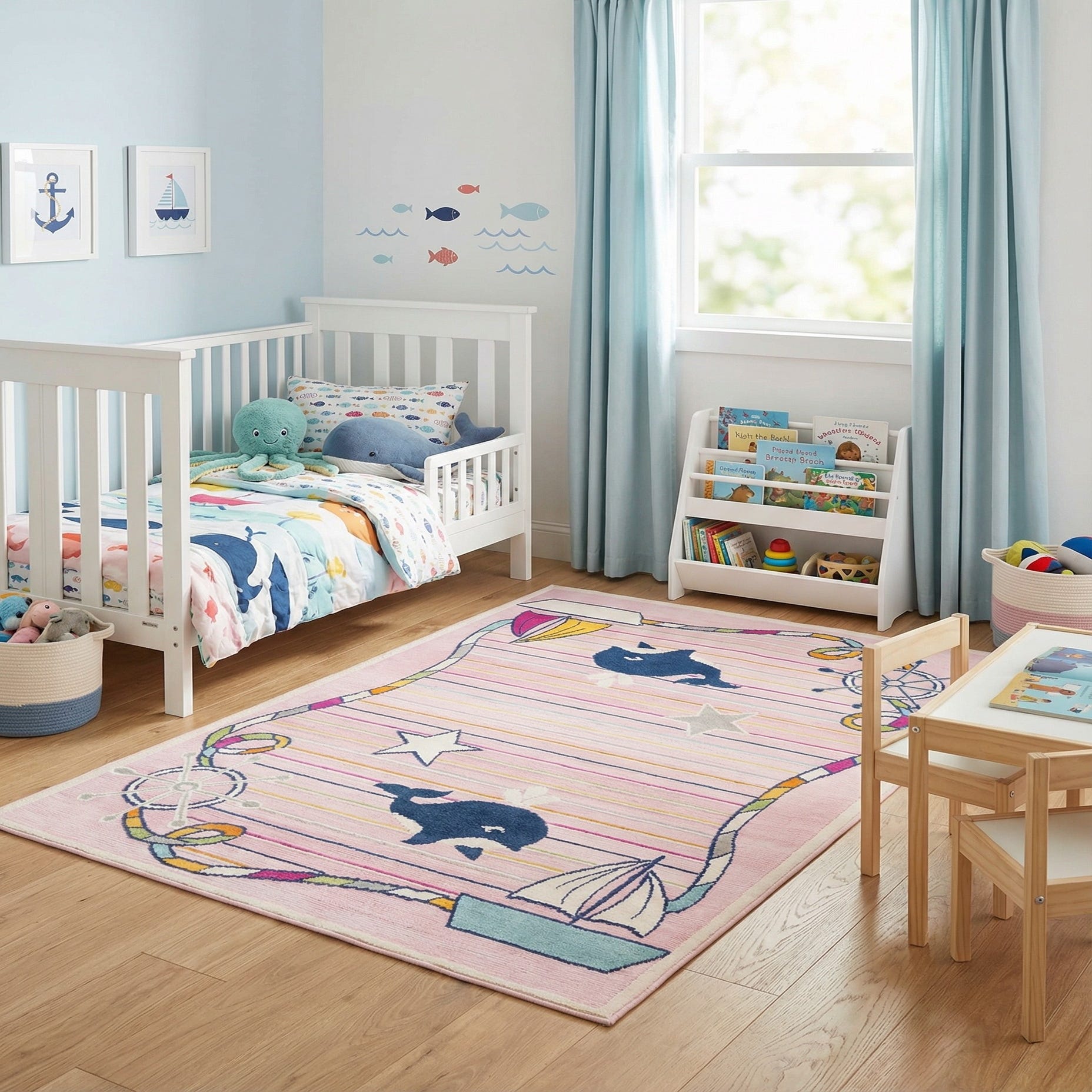 Primary color is Pink. Colors in this rug include: Pink, Gray, Ivory, Light Blue, Light Green, Navy Blue, Yellow, Orange.