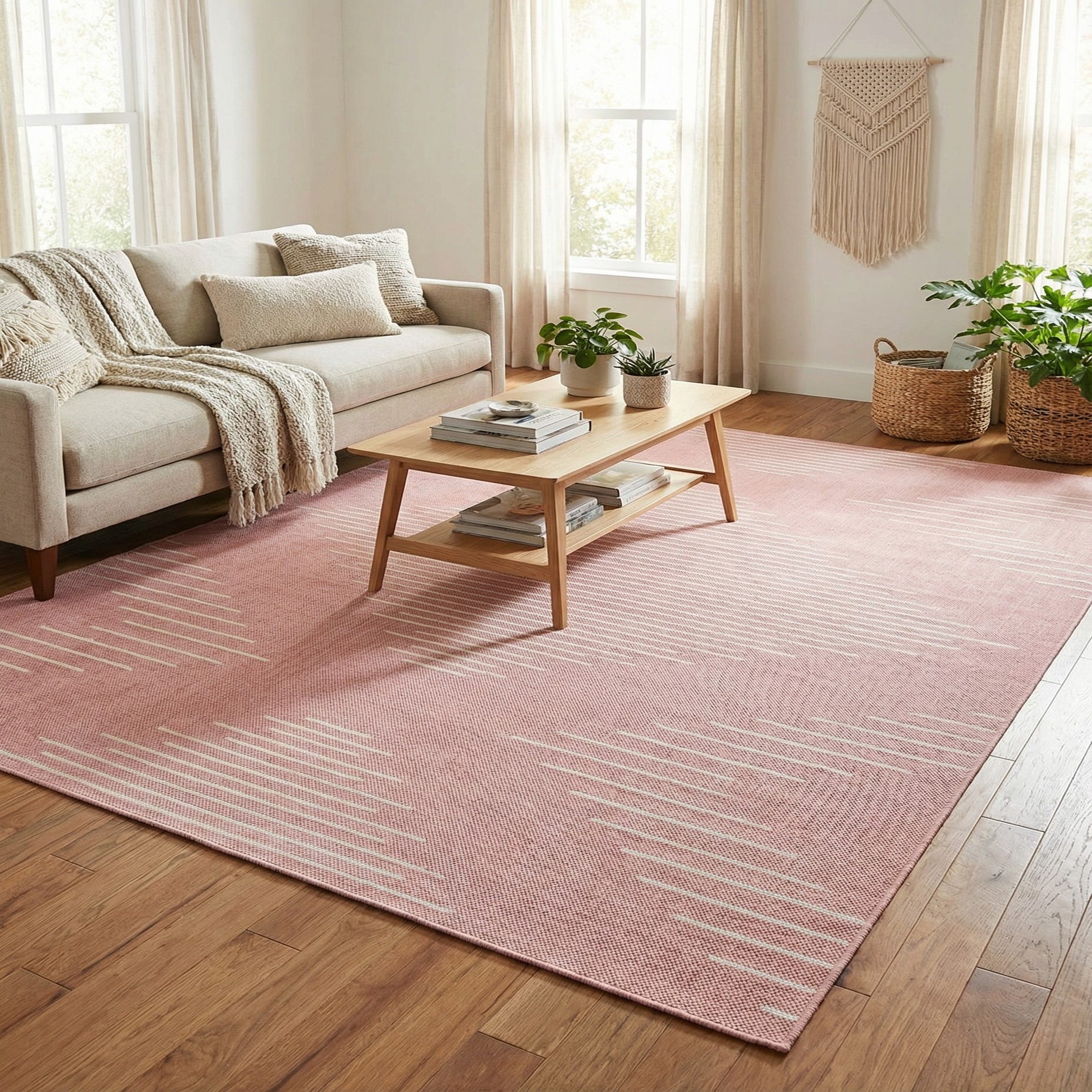 Primary color is Pink. Colors in this rug include: Pink, Ivory.