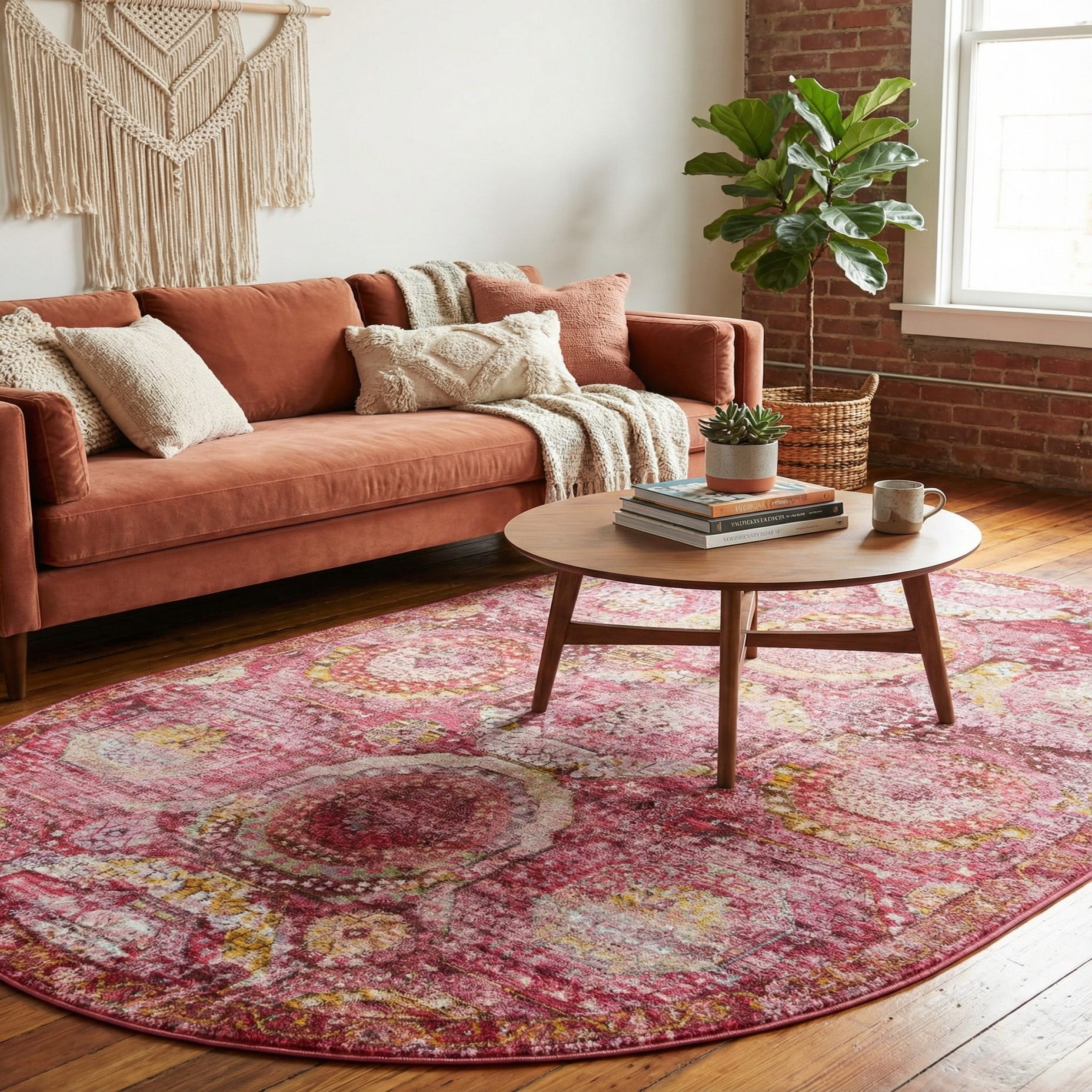 Primary color is Pink. Colors in this rug include: Pink, Burgundy, Ivory, Olive, Orange, Purple, Red.