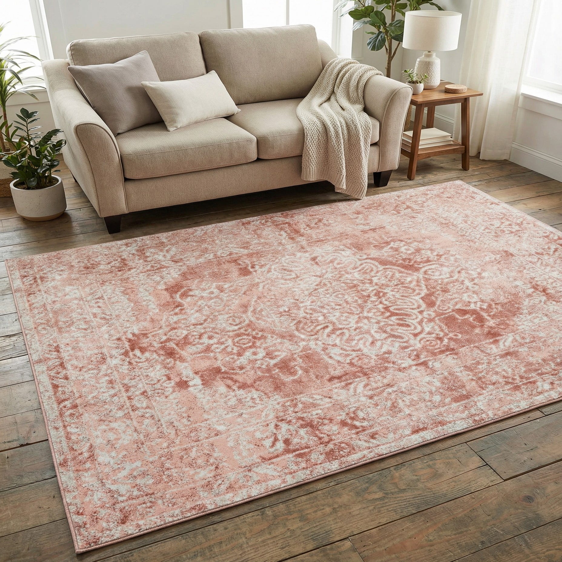 Primary color is Pink. Colors in this rug include: Pink, Ivory.