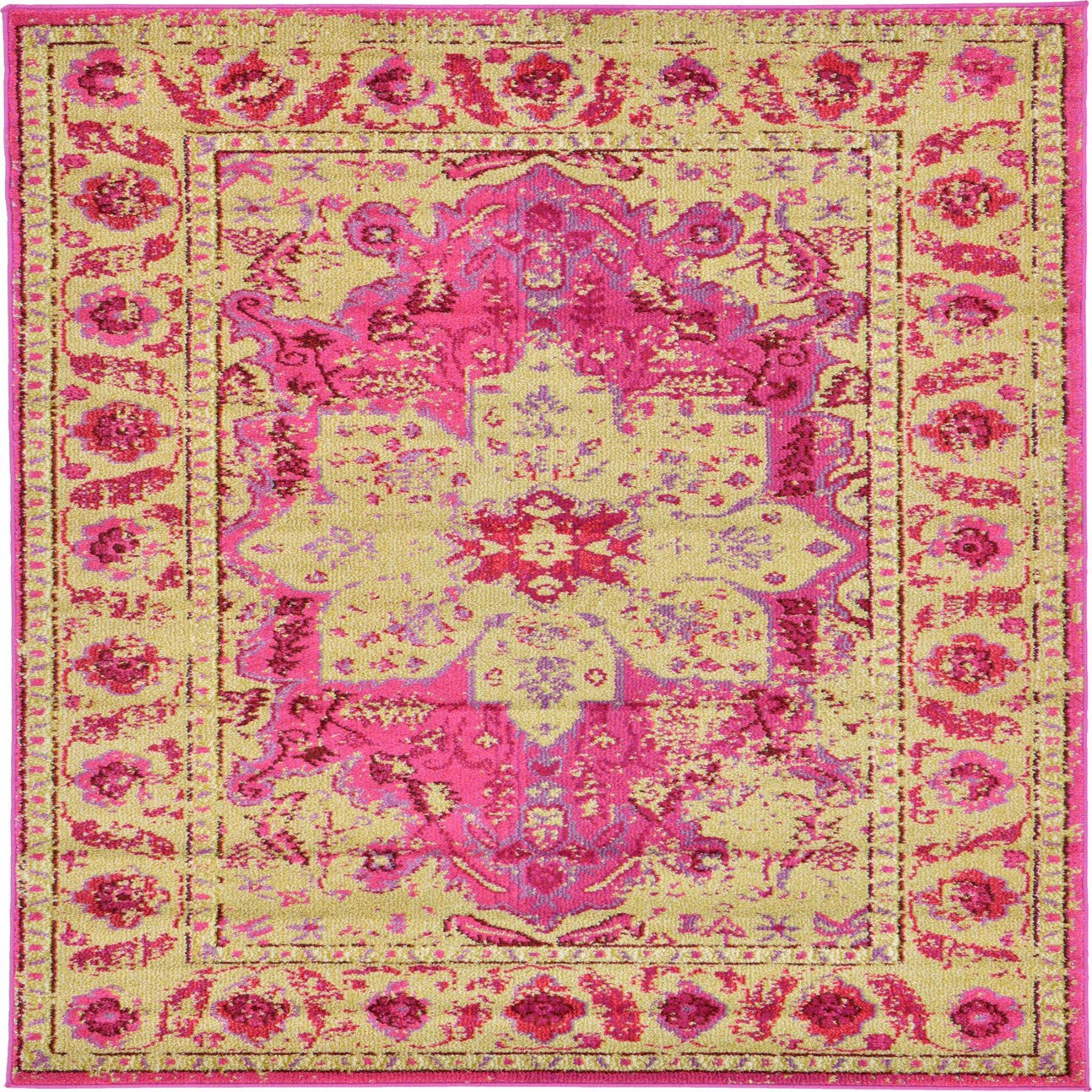 Primary color is Pink. Colors in this rug include: Pink, Burgundy, Gold, Purple, Ivory.
