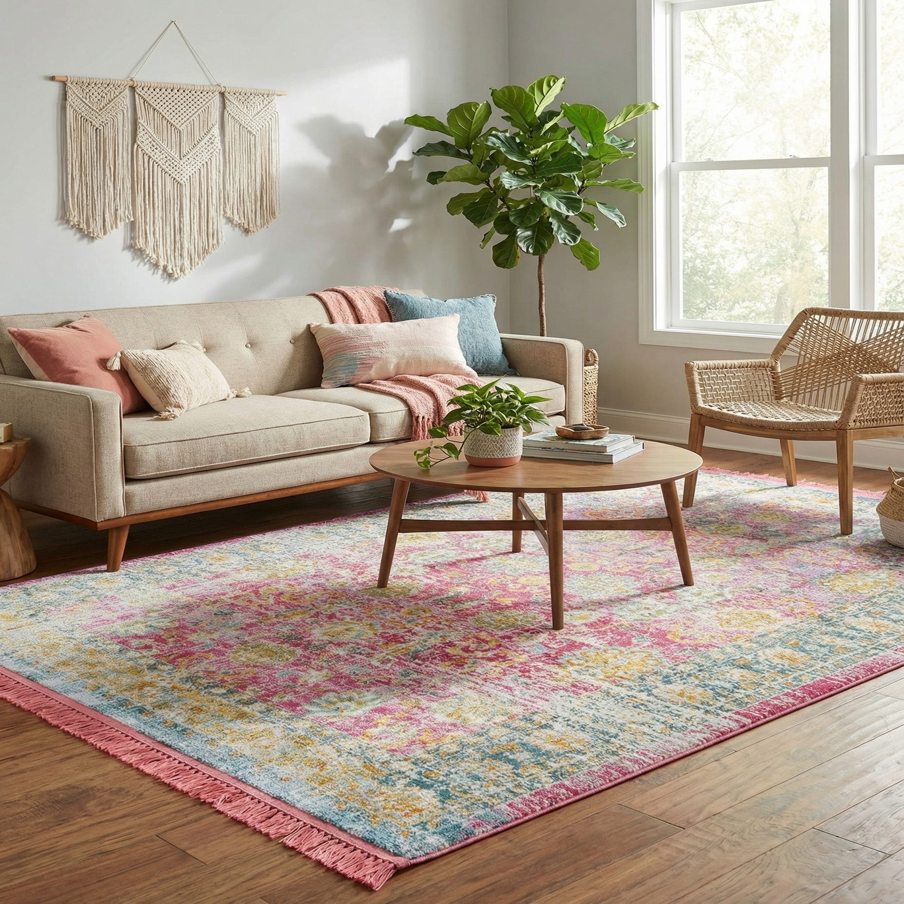 Primary color is Pink. Colors in this rug include: Pink, Blue, Ivory, Green, Yellow, Light Blue.