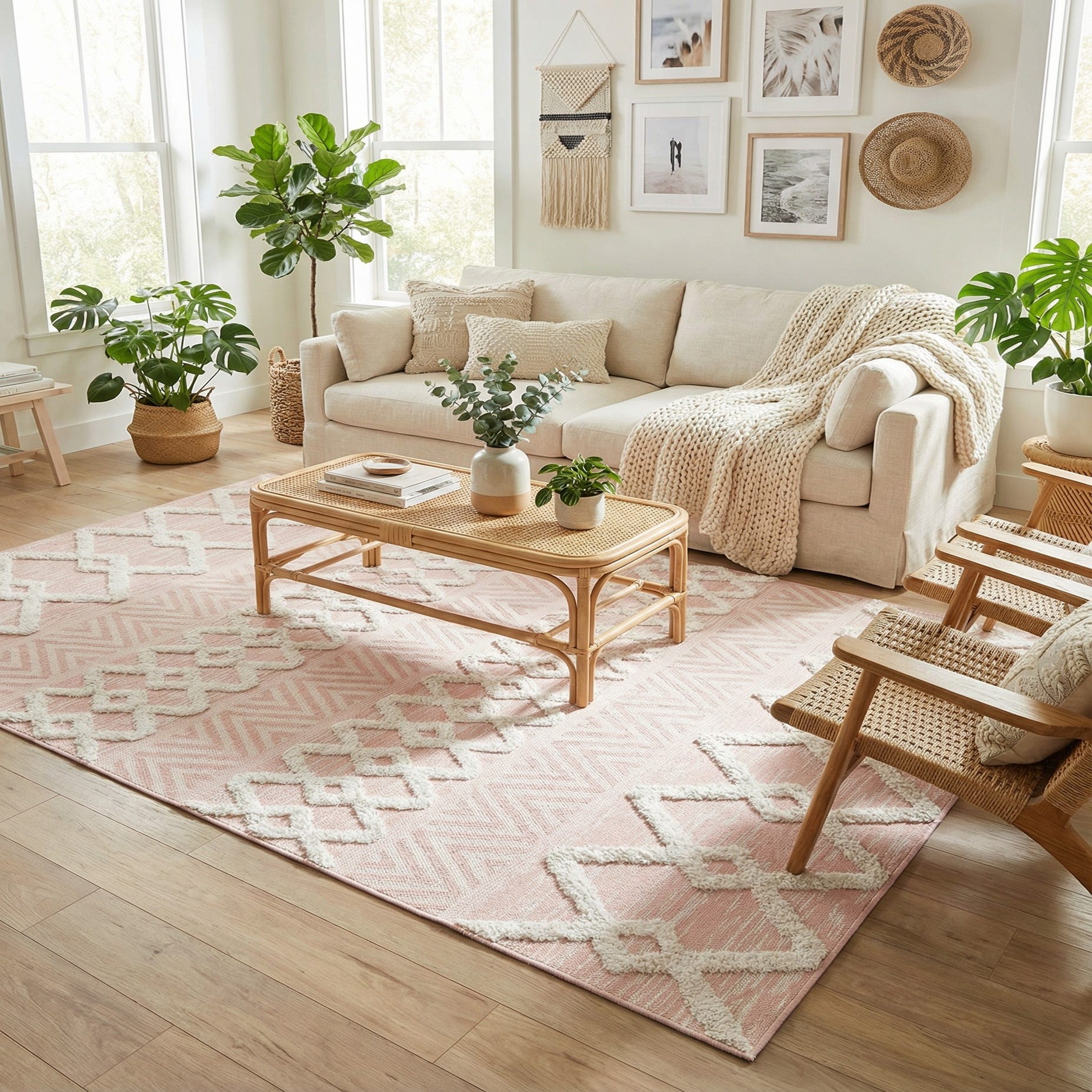 Primary color is Pink. Colors in this rug include: Pink, Ivory.