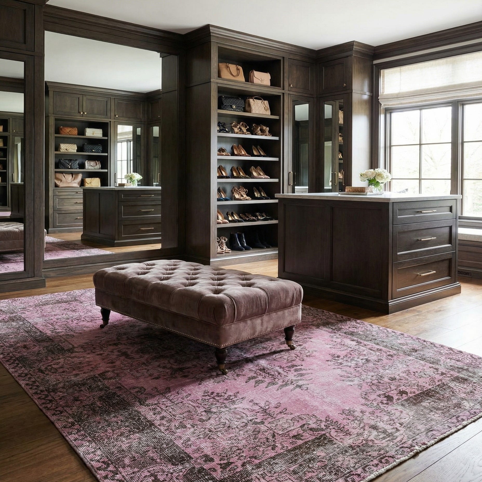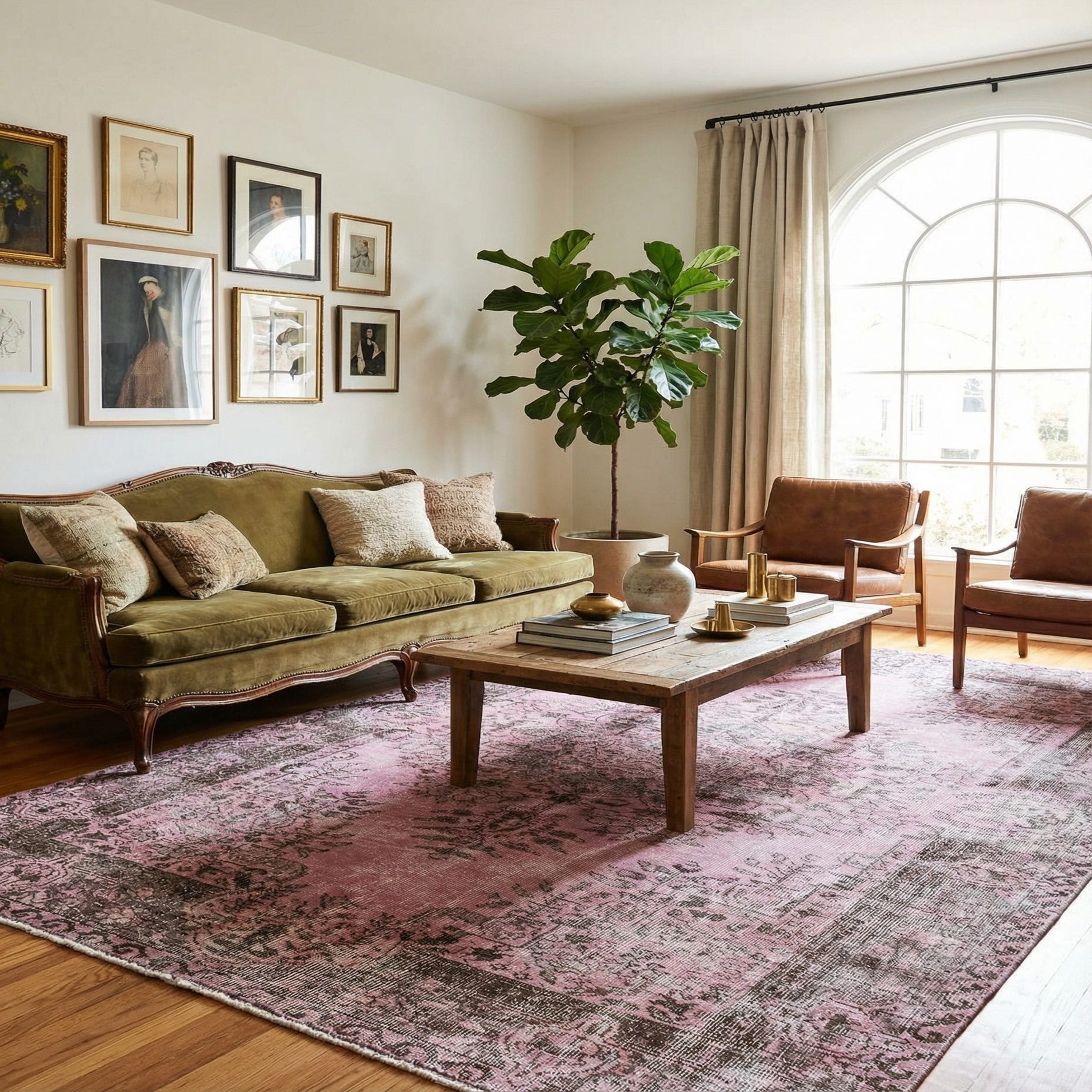 Primary color is Pink. Colors in this rug include: Pink, Brown, Beige, Plum Red, Puce.