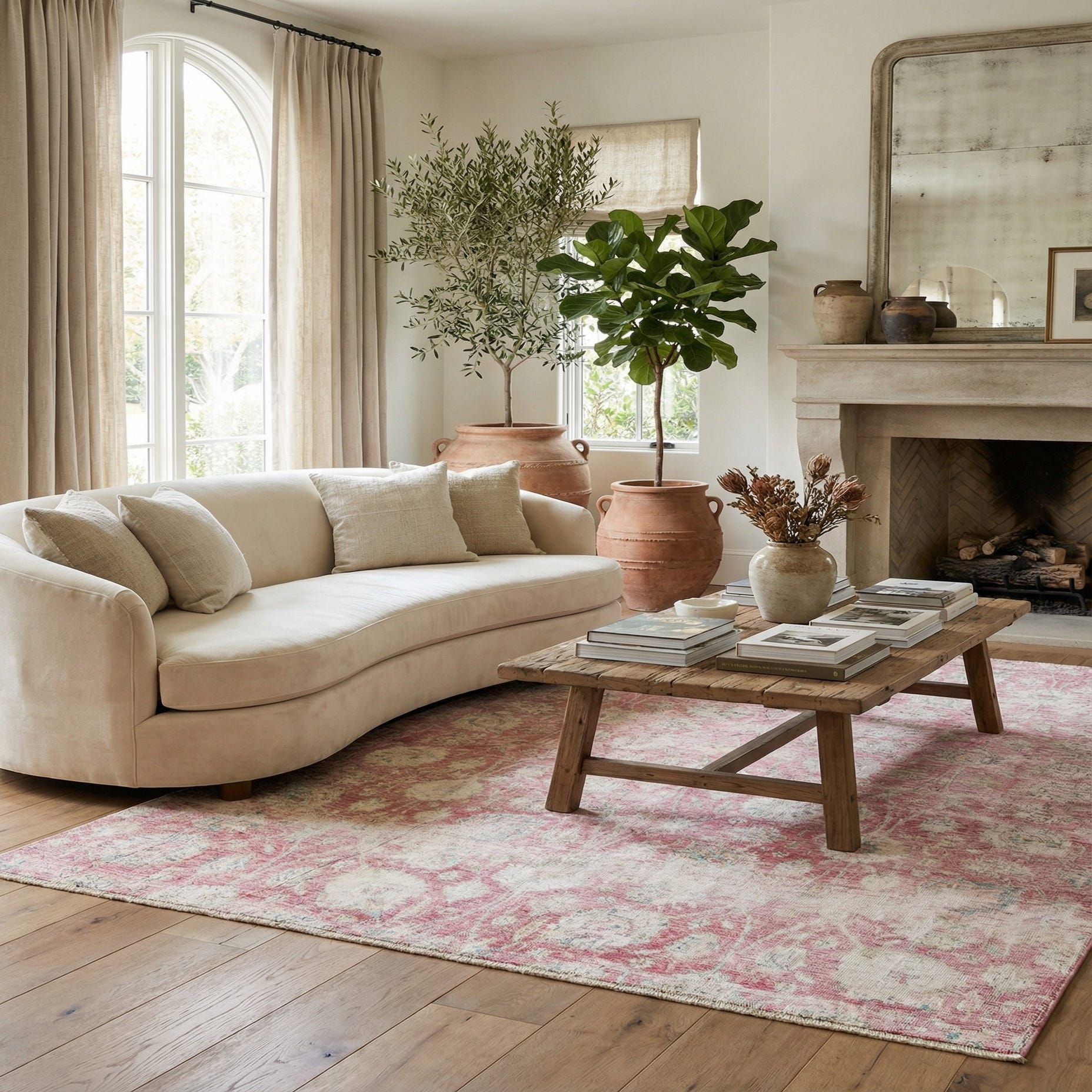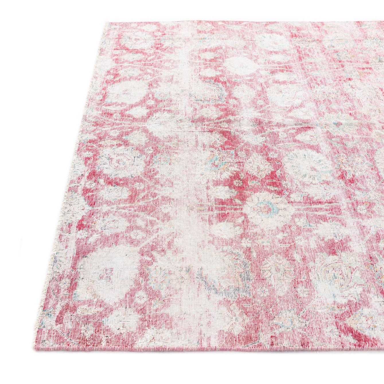 Primary color is Pink. Colors in this rug include: Pink, Blue, Ivory, Green, Beige.