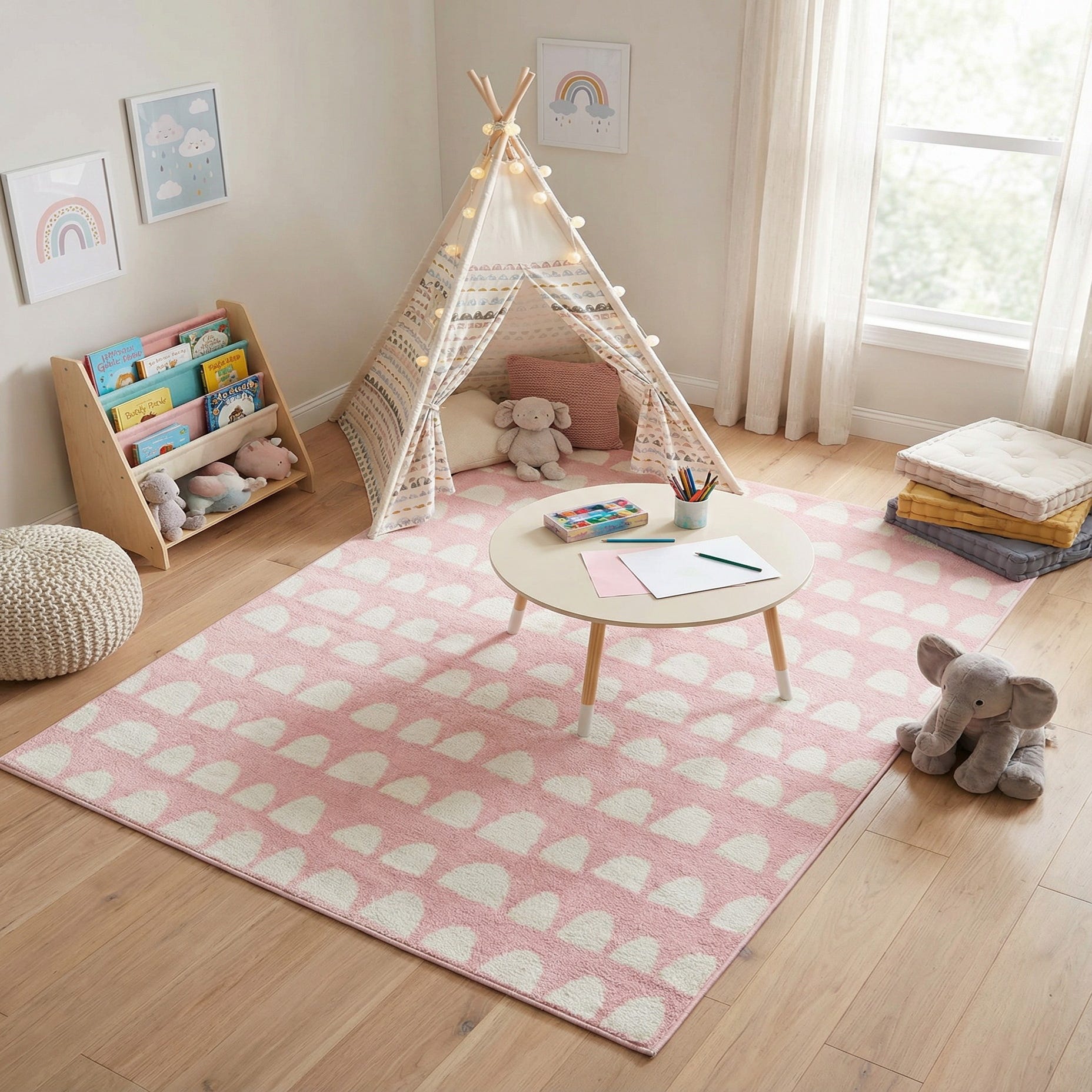 Primary color is Pink. Colors in this rug include: Pink, Ivory.