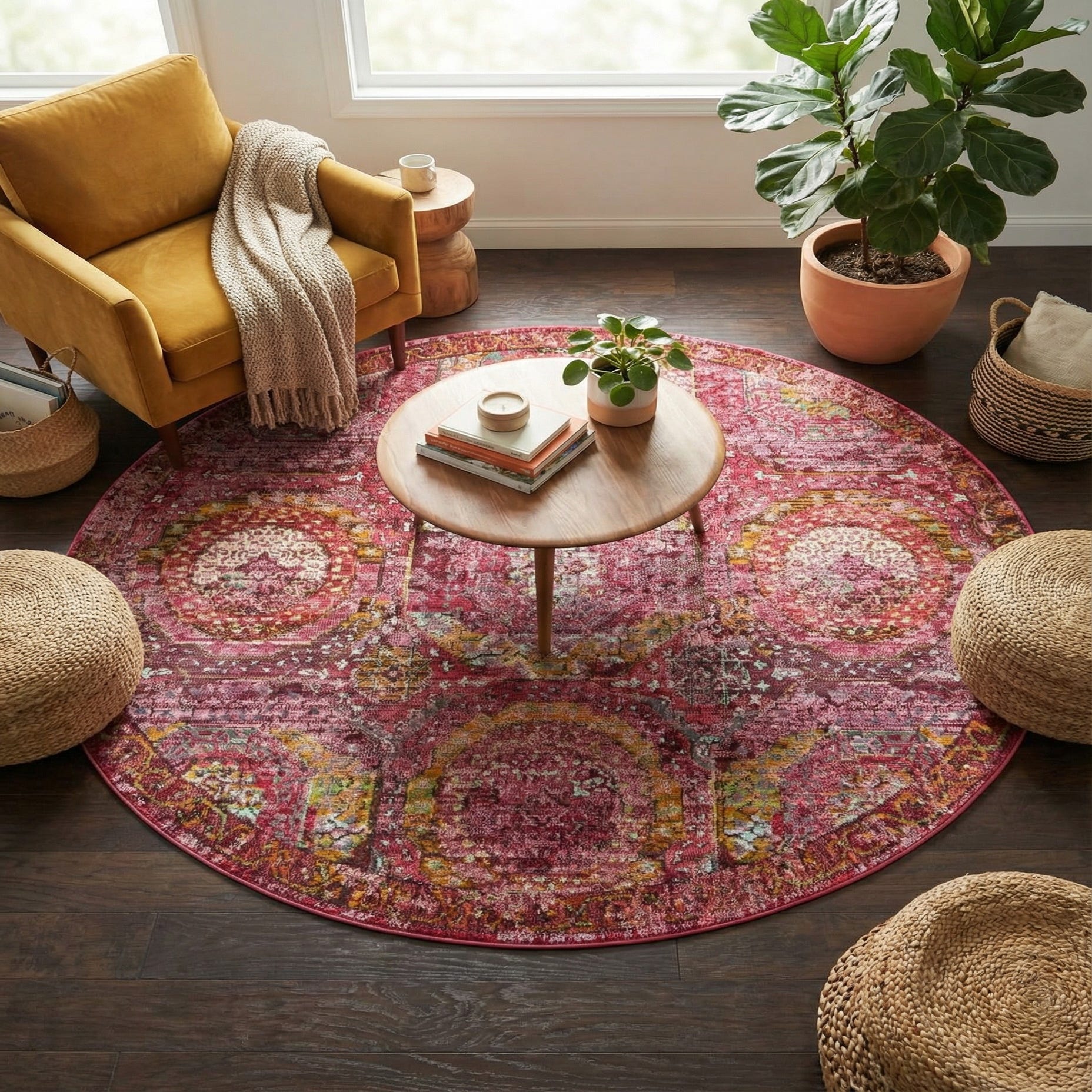 Primary color is Pink. Colors in this rug include: Pink, Burgundy, Ivory, Olive, Orange, Red, Purple.