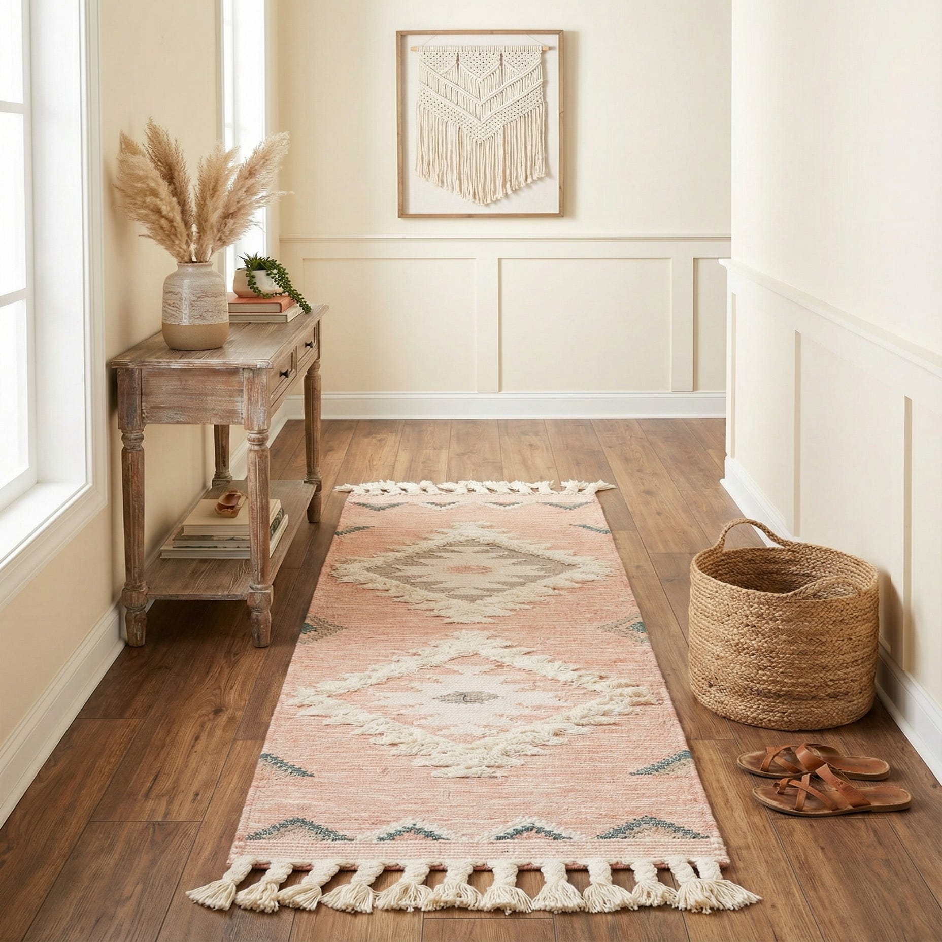 Primary color is Pink. Colors in this rug include: Pink, Cream, Gray, Teal.