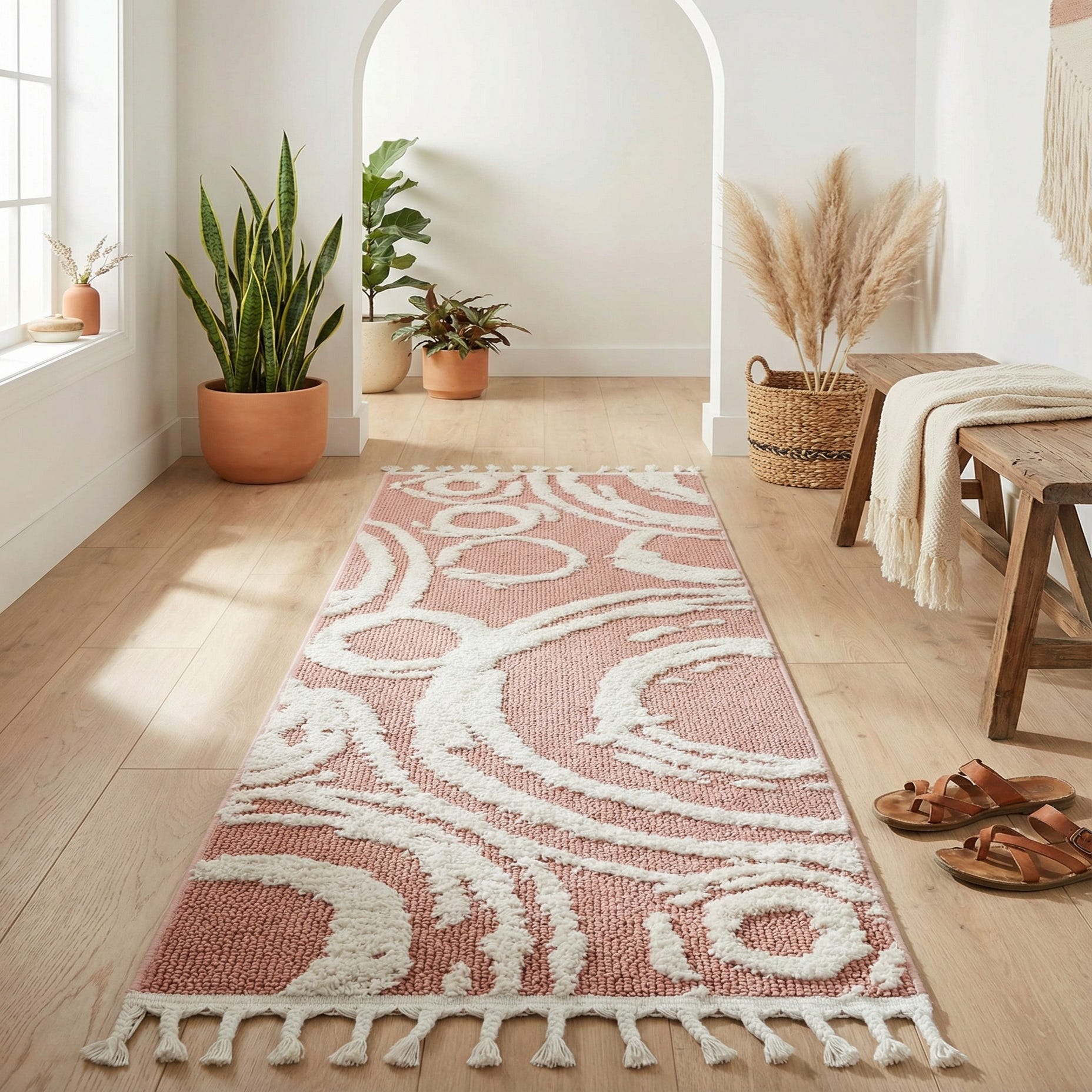 Primary color is Pink. Colors in this rug include: Pink, Ivory.