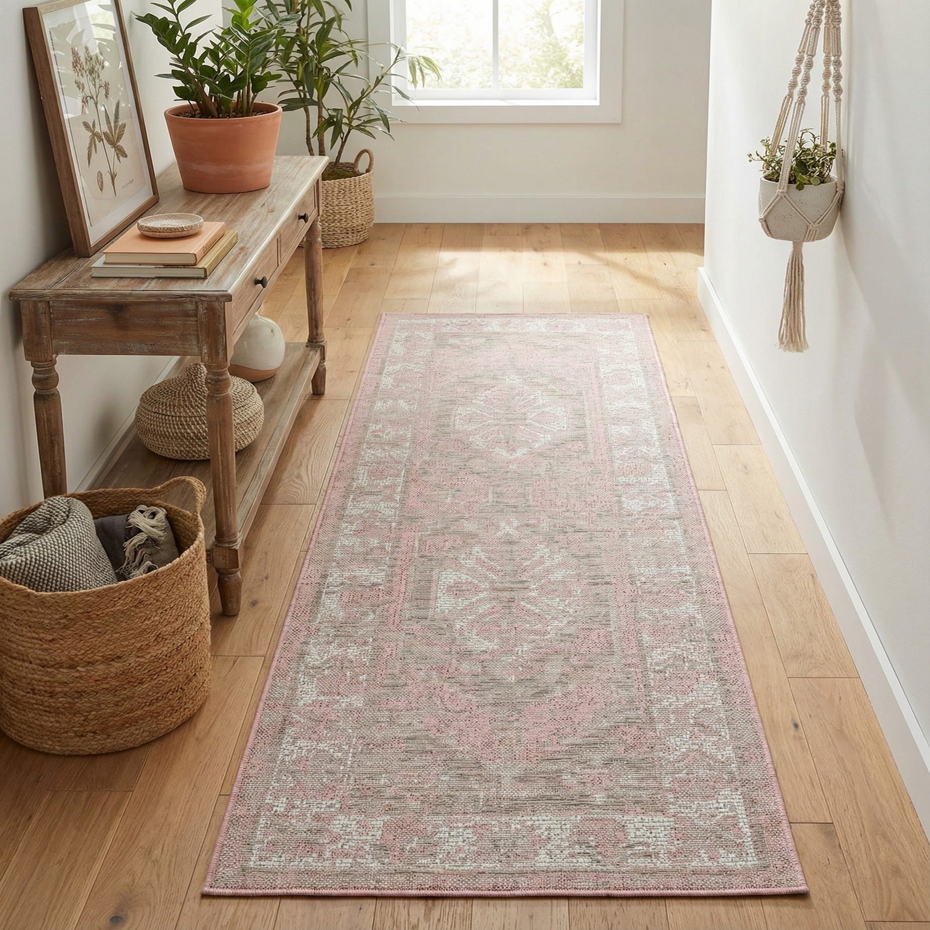 Primary color is Pink. Colors in this rug include: Pink, Gray, Ivory.