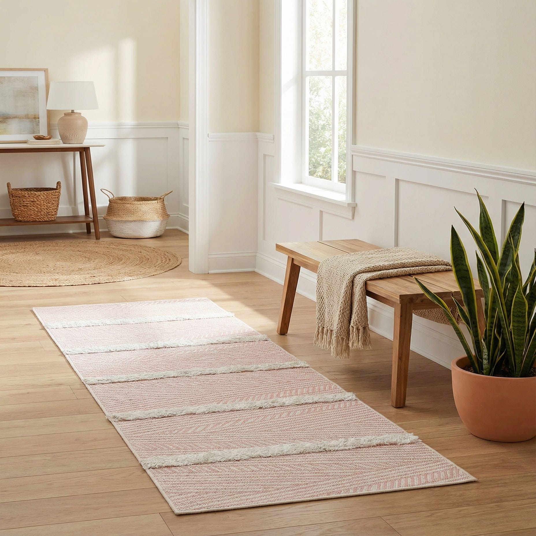 Primary color is Pink. Colors in this rug include: Pink, Ivory.