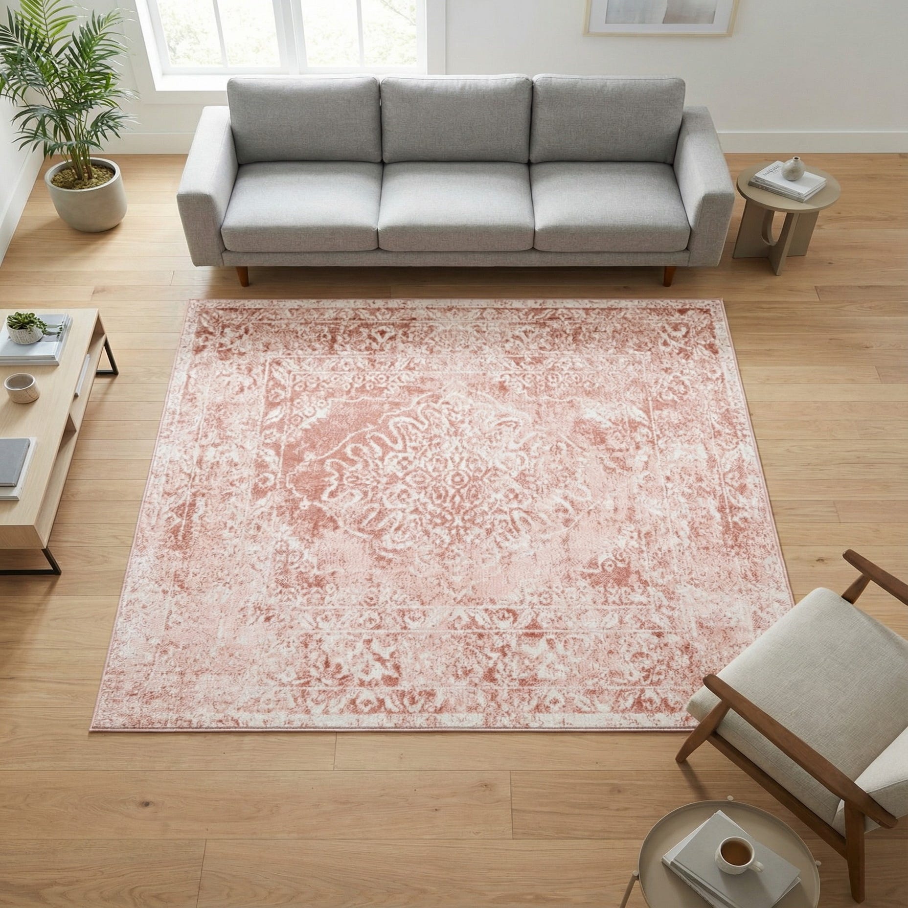 Primary color is Pink. Colors in this rug include: Pink, Ivory.