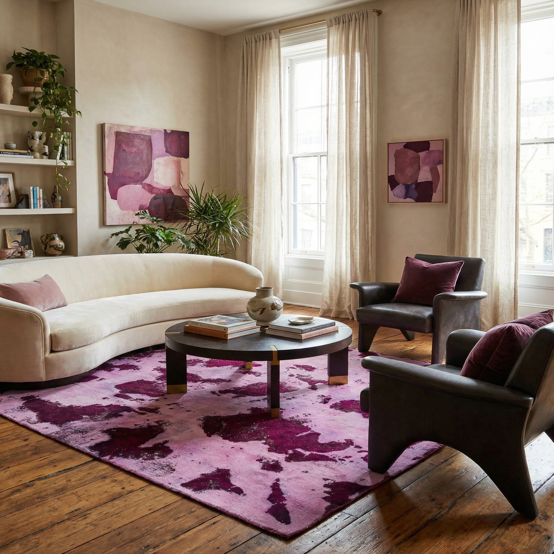 Primary color is Pink. Colors in this rug include: Pink, Burgundy.