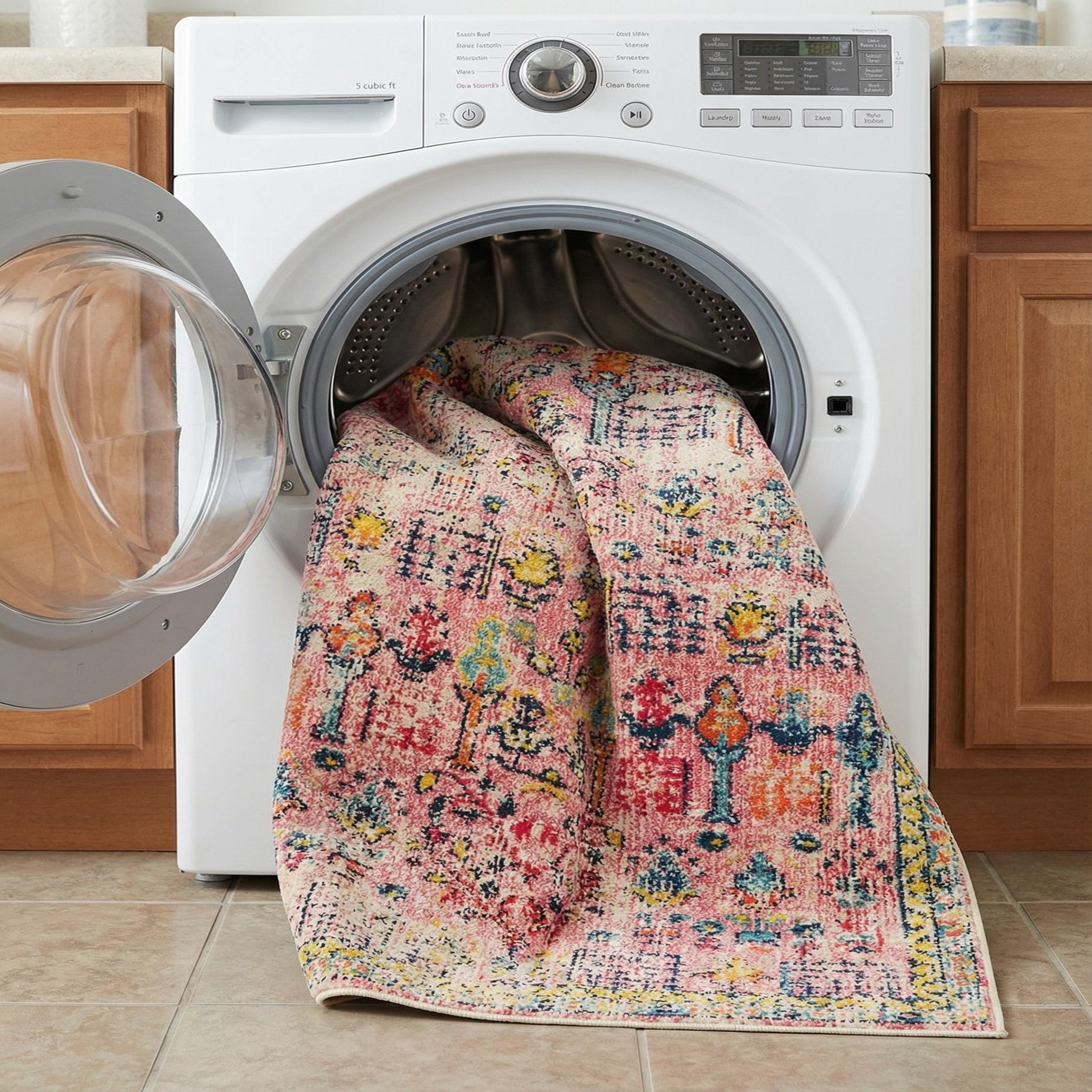 Primary color is Pink. Colors in this rug include: Pink, Blue, Gold, Navy Blue, Olive, Orange, Red, Purple.