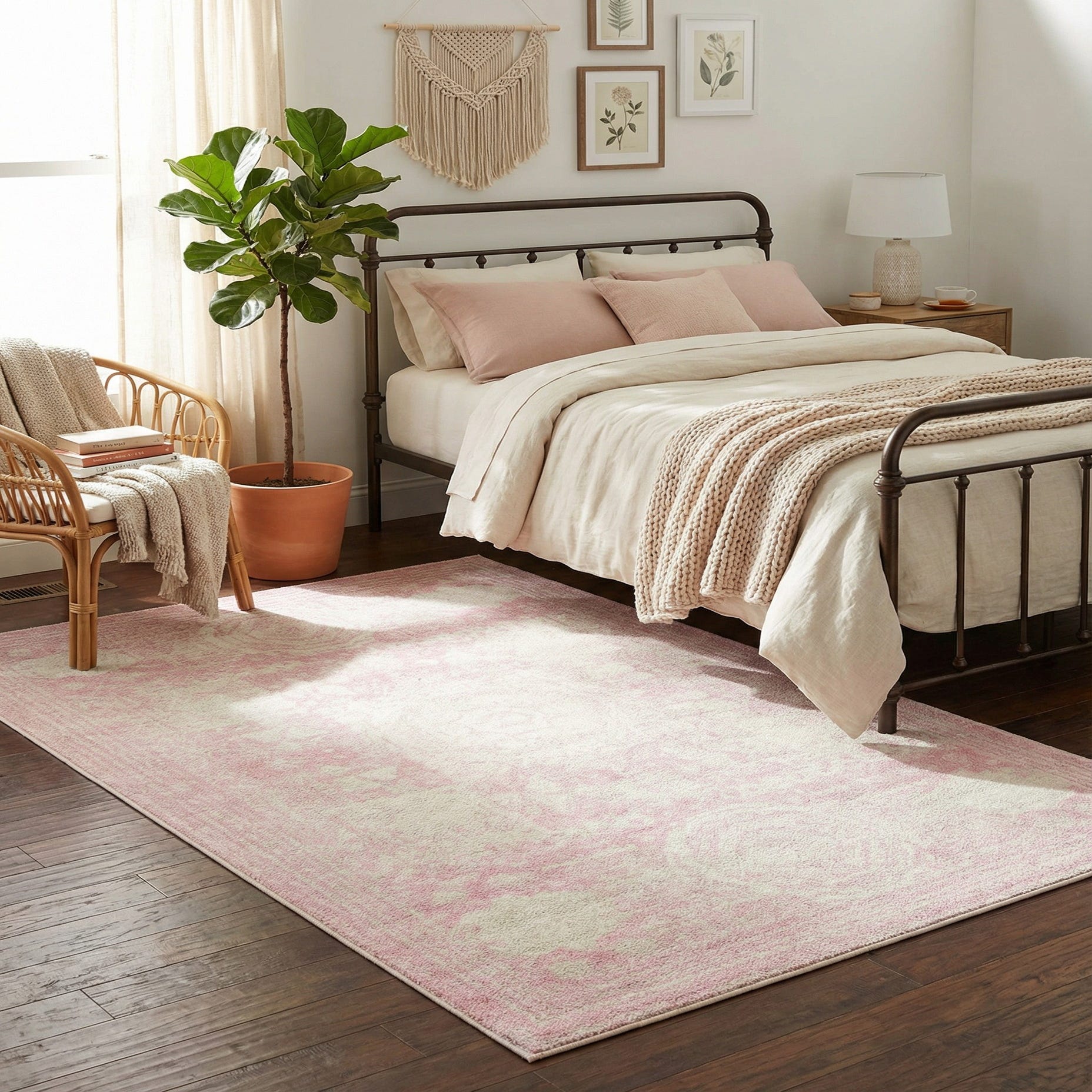 Primary color is Pink. Colors in this rug include: Pink, Ivory.