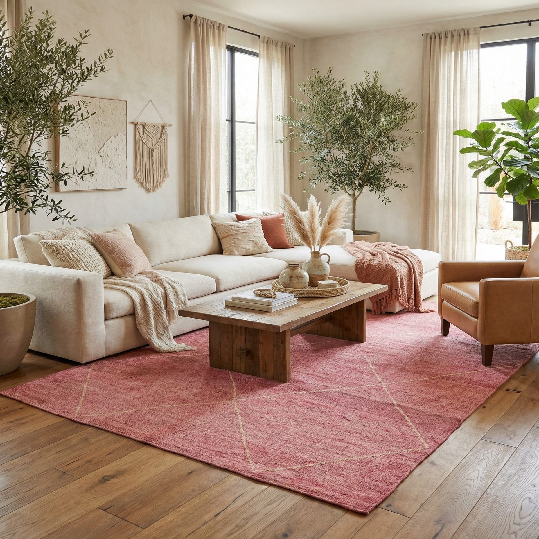 Primary color is Pink. Colors in this rug include: Pink, Cream.