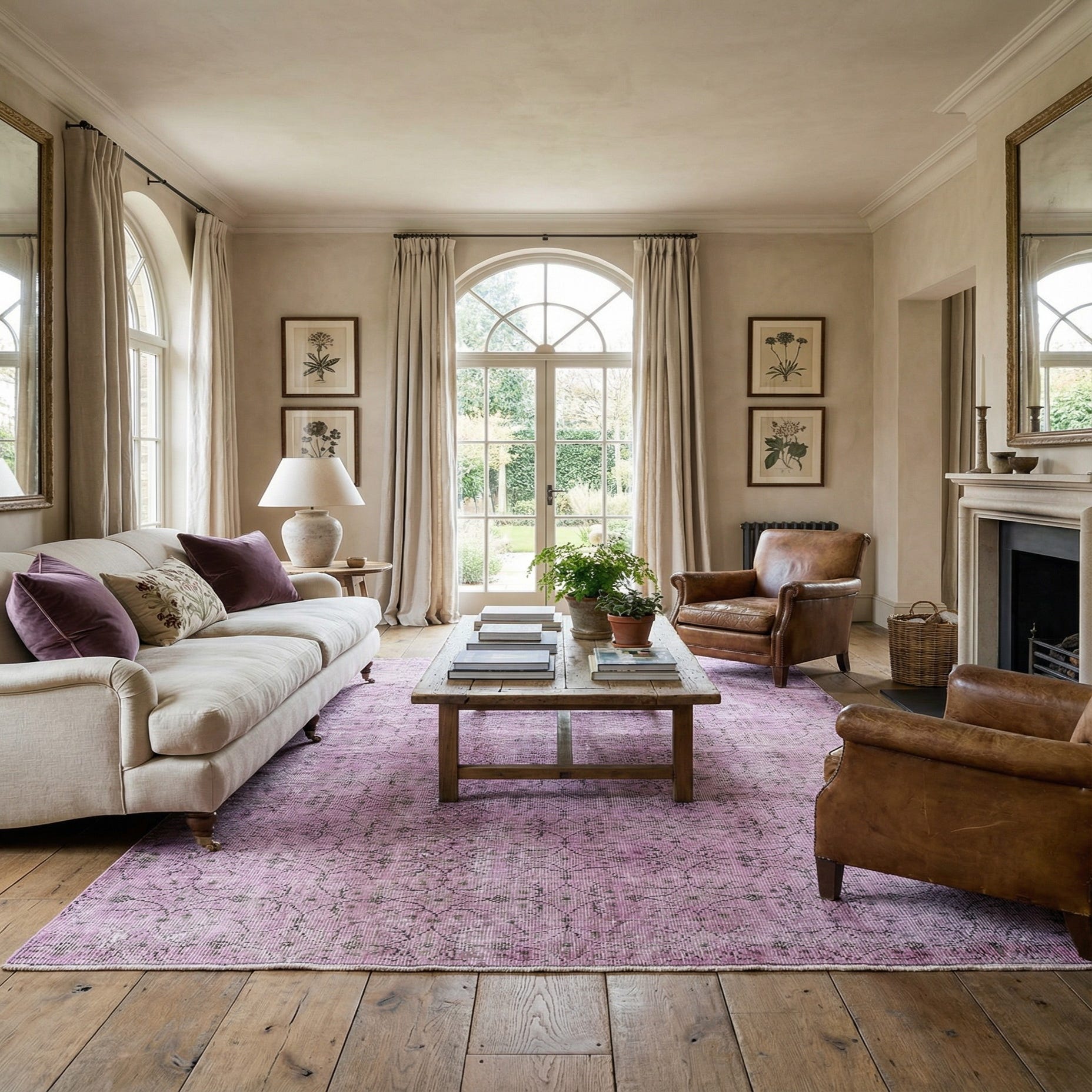 Primary color is Pink. Colors in this rug include: Pink, Beige, Black, Brown, Light Brown.