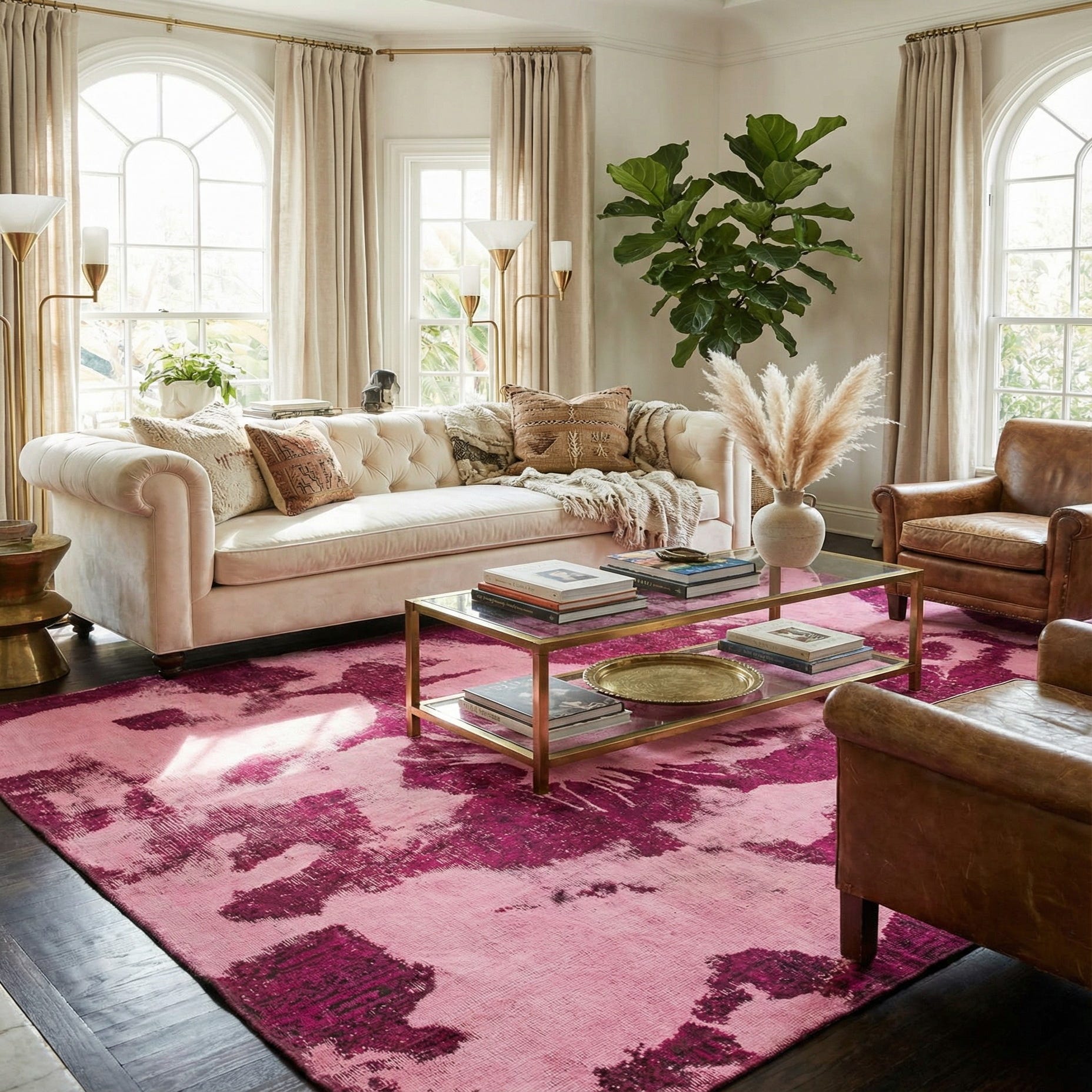 Primary color is Pink. Colors in this rug include: Pink, Burgundy, Red, Brown.