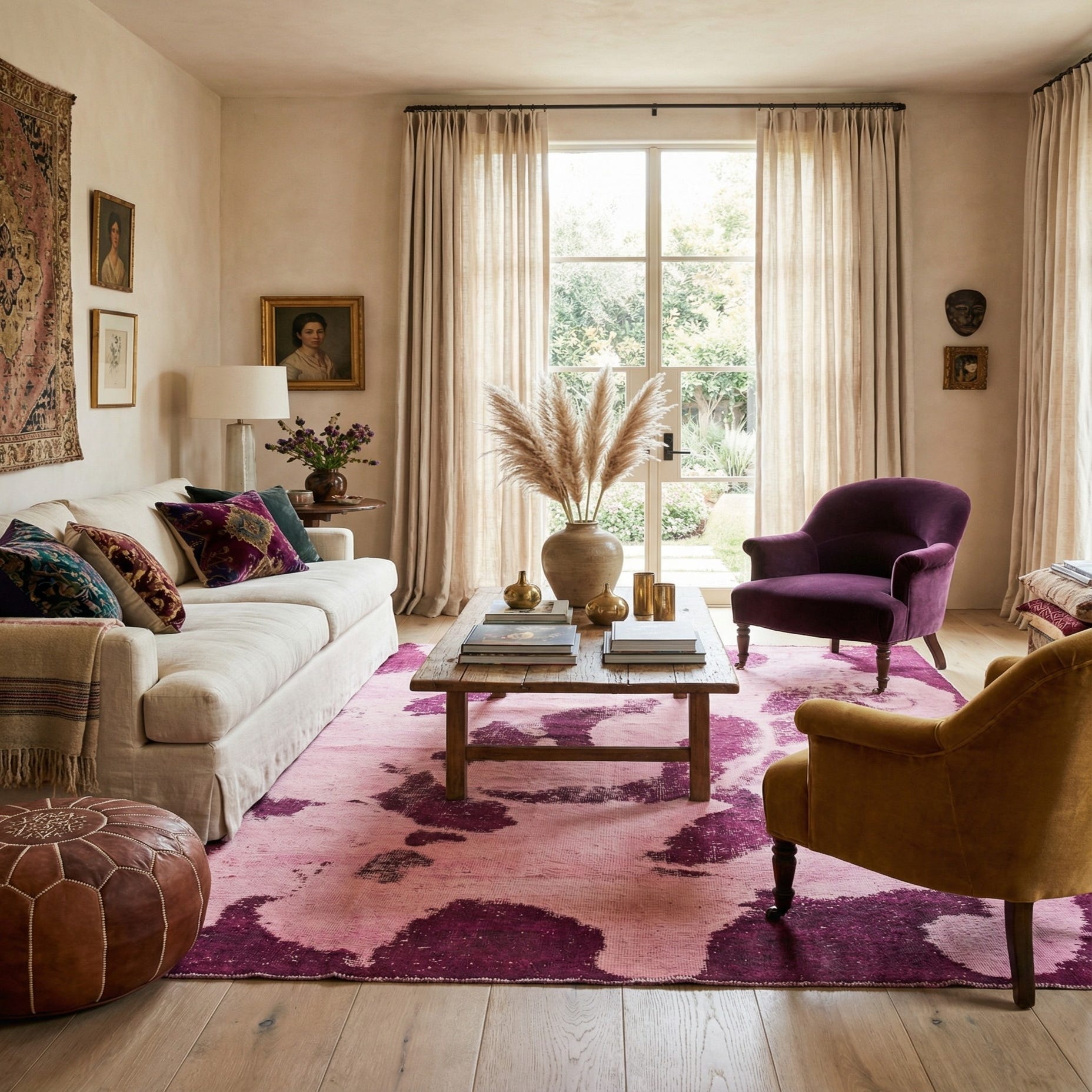 Primary color is Pink. Colors in this rug include: Pink, Burgundy, Maroon.