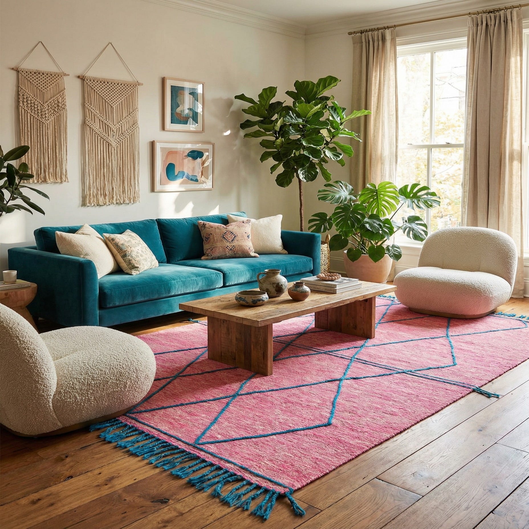 Primary color is Pink. Colors in this rug include: Pink, Ivory, Blue.
