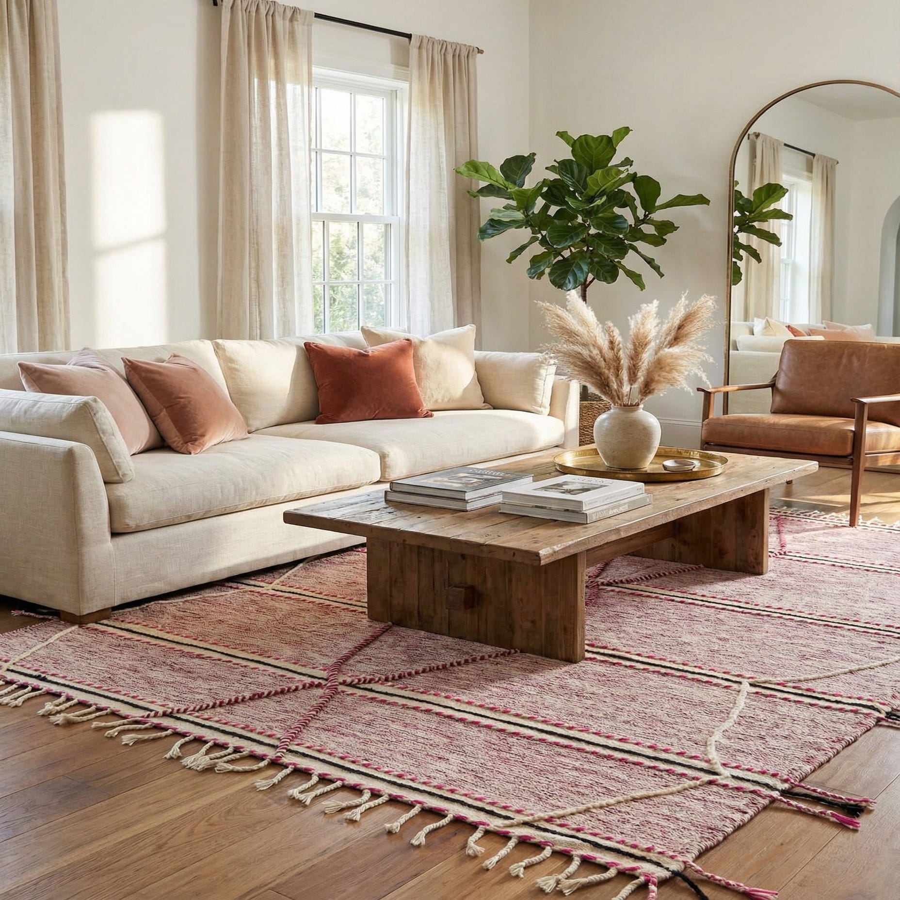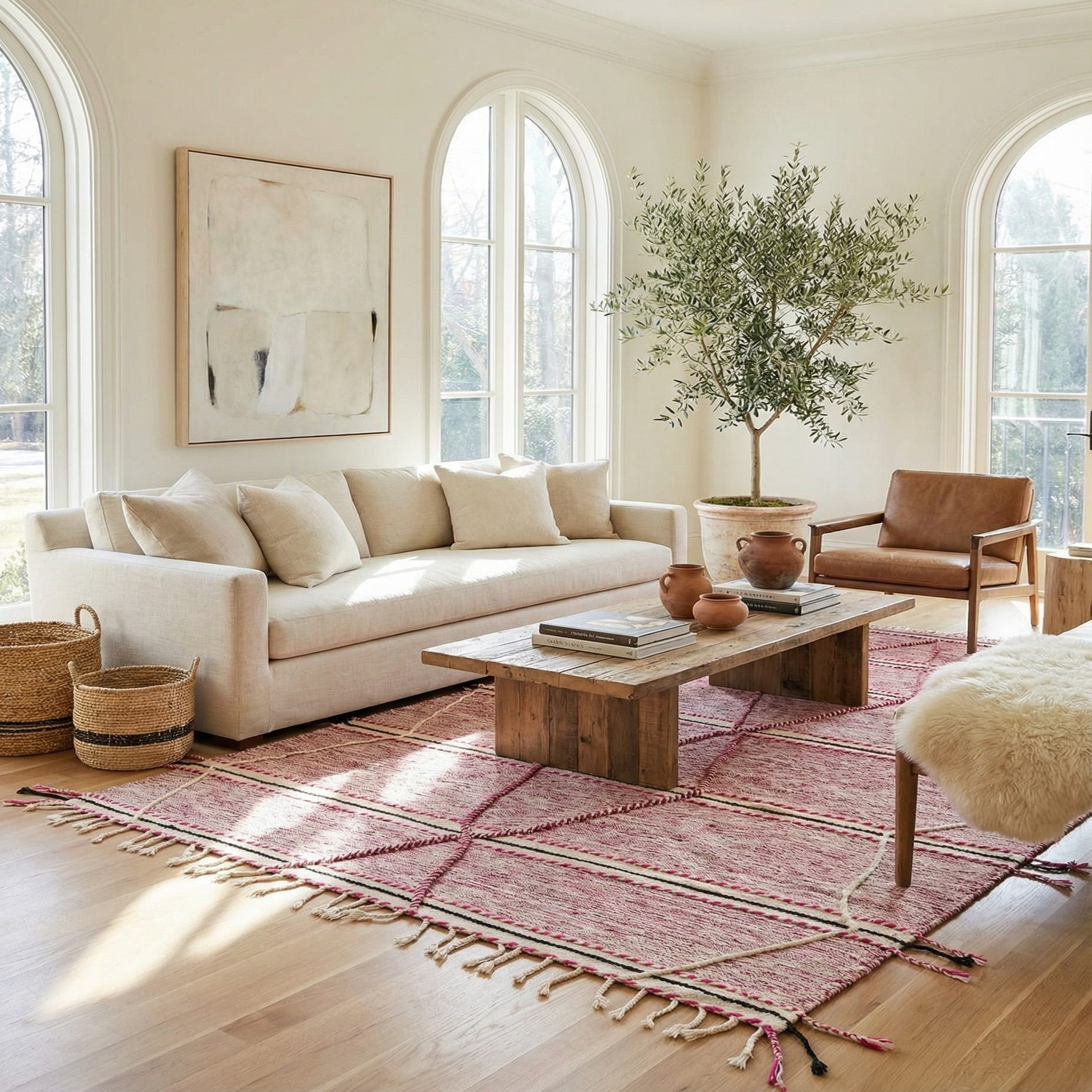 Primary color is Pink. Colors in this rug include: Pink, Black, Ivory, Violet.