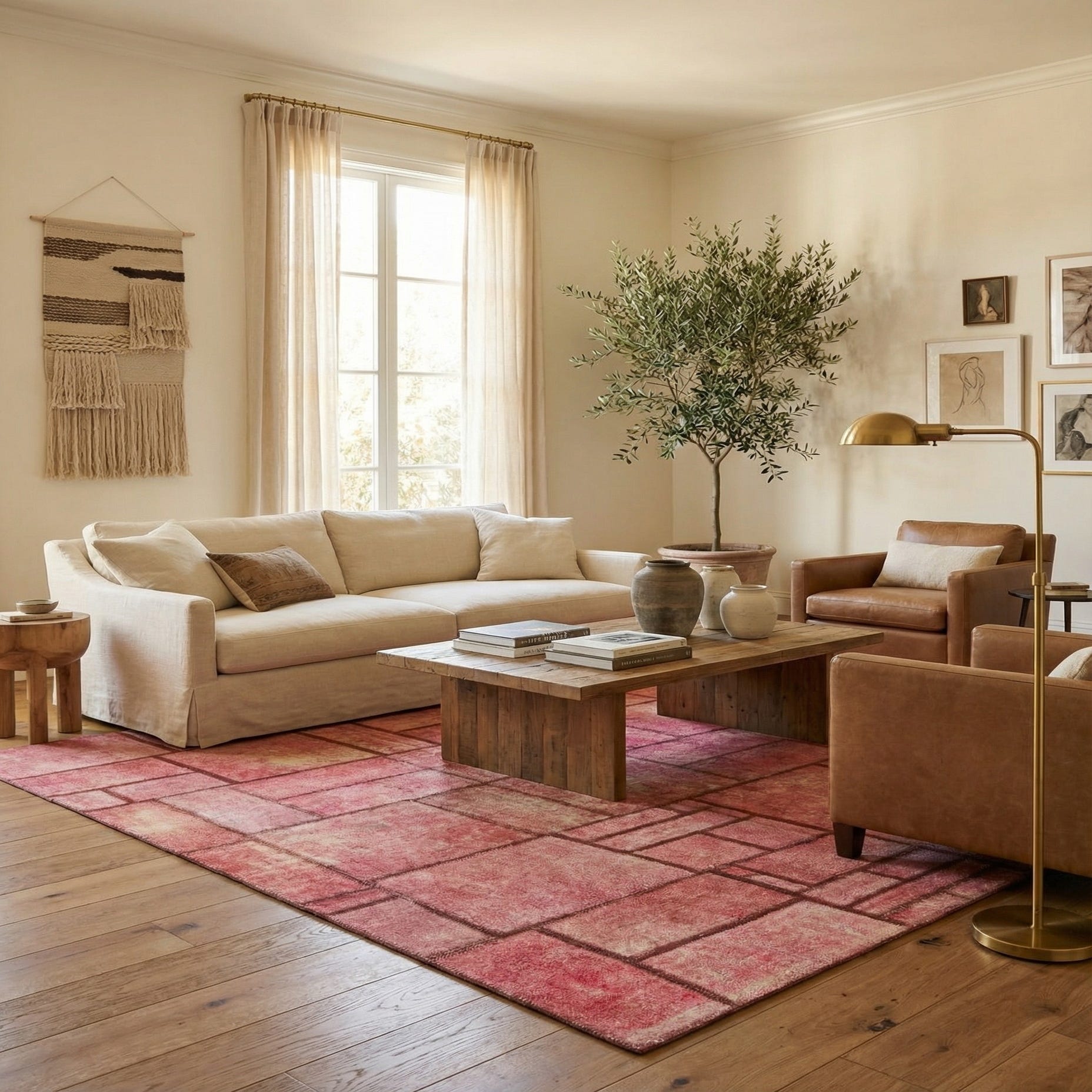 Primary color is Pink. Colors in this rug include: Pink, Brown, Ivory, Puce.