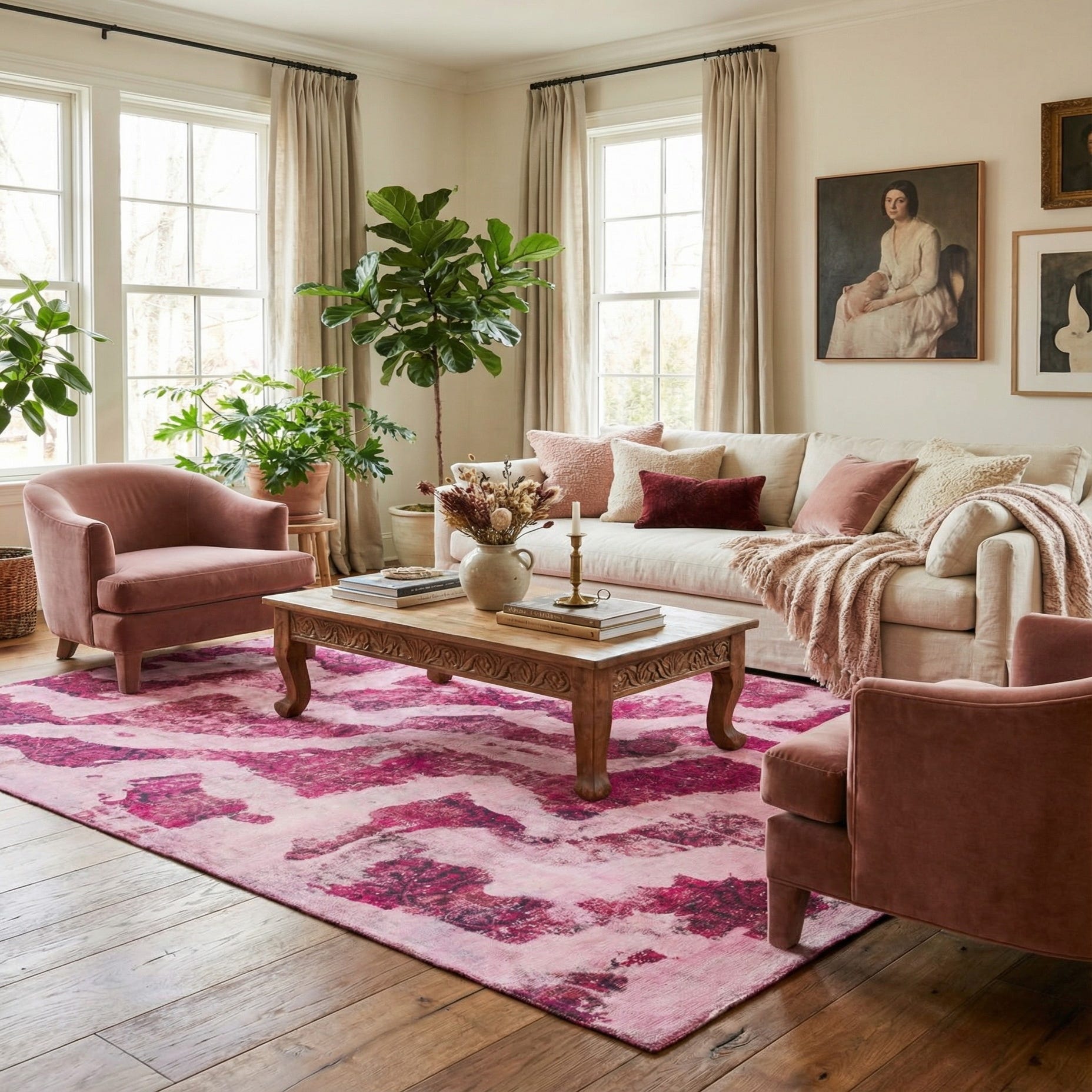 Primary color is Pink. Colors in this rug include: Pink, Puce, Red, Burgundy, Navy Blue.