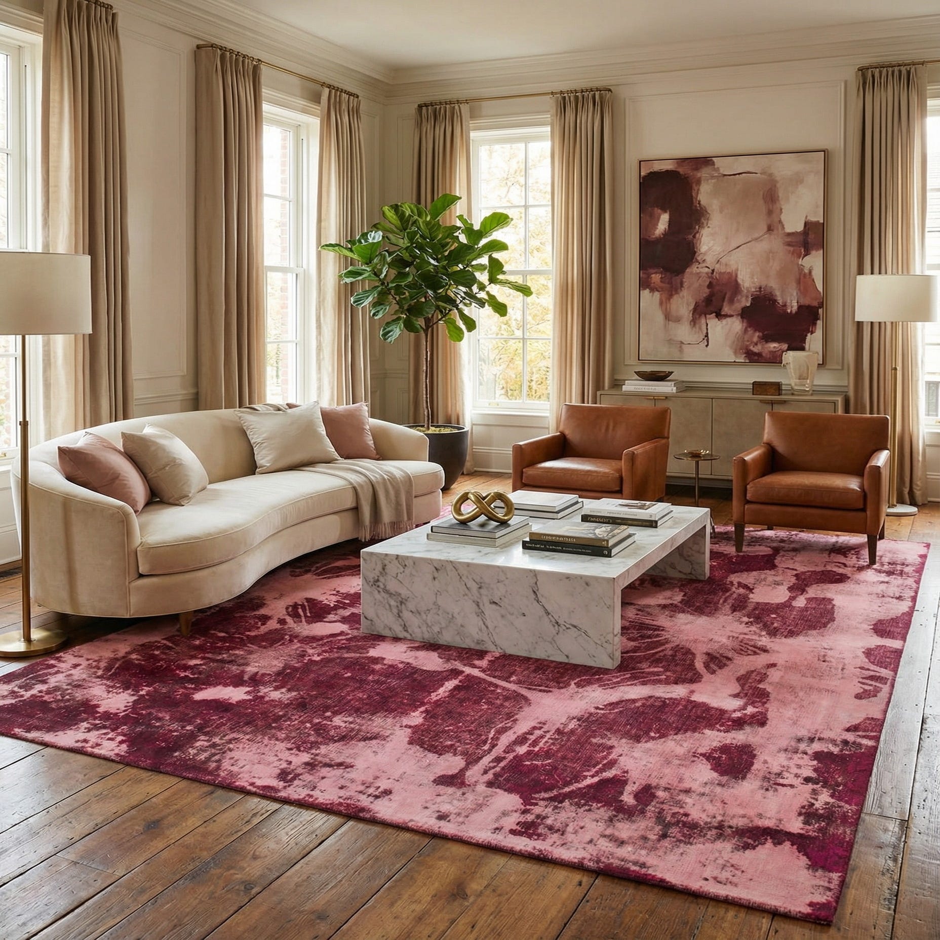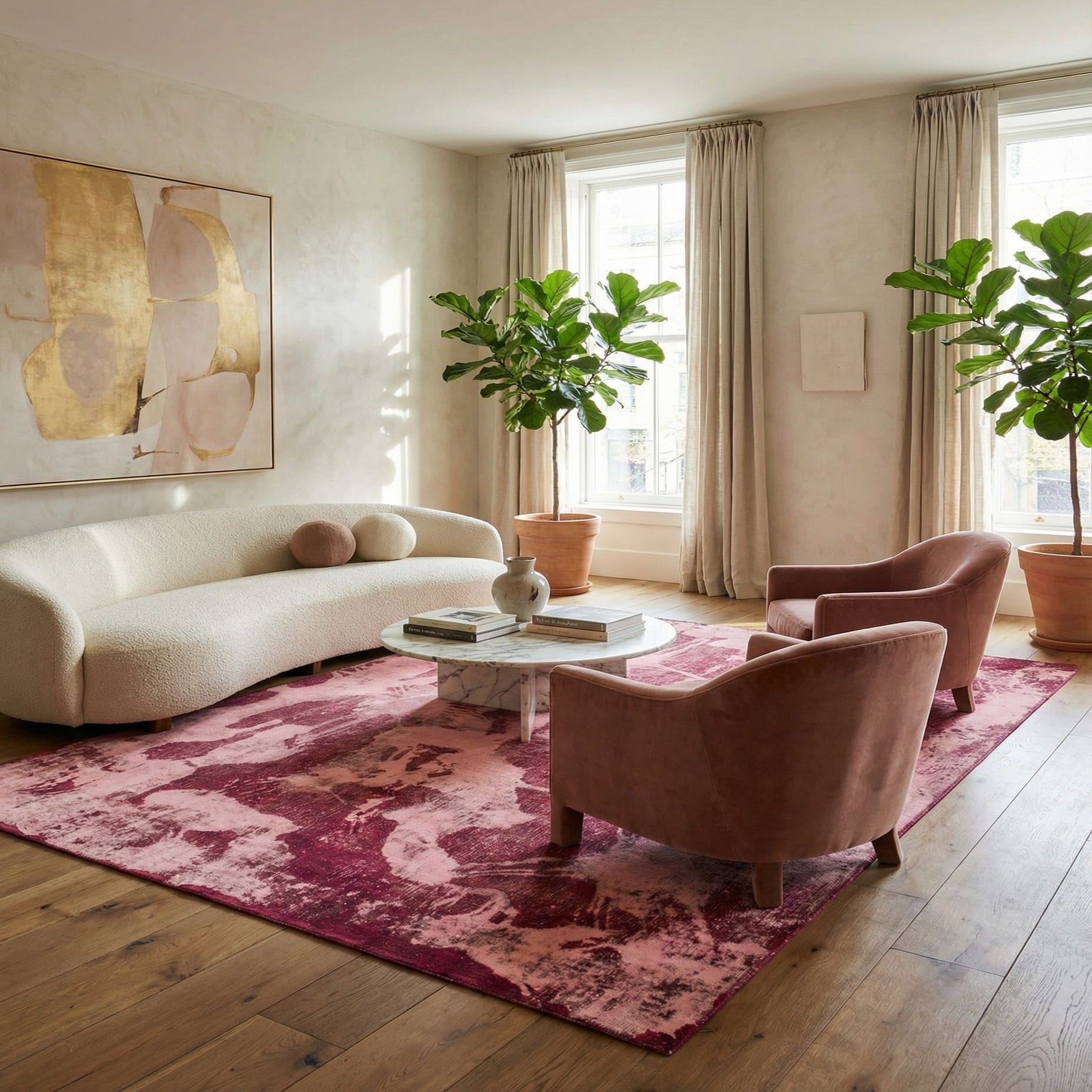 Primary color is Pink. Colors in this rug include: Pink, Burgundy, Red, Brown.