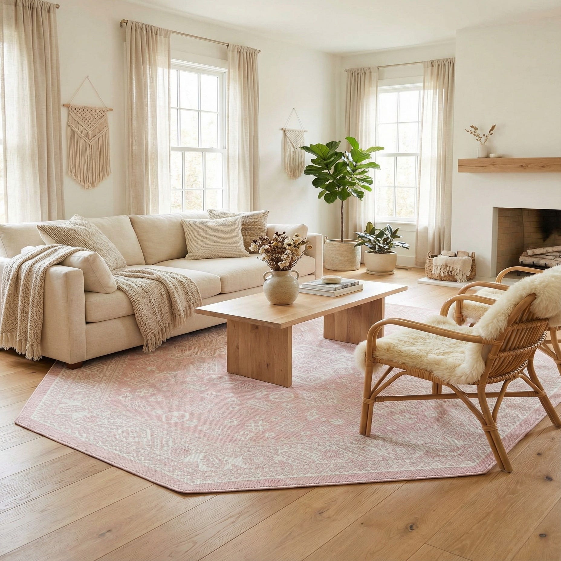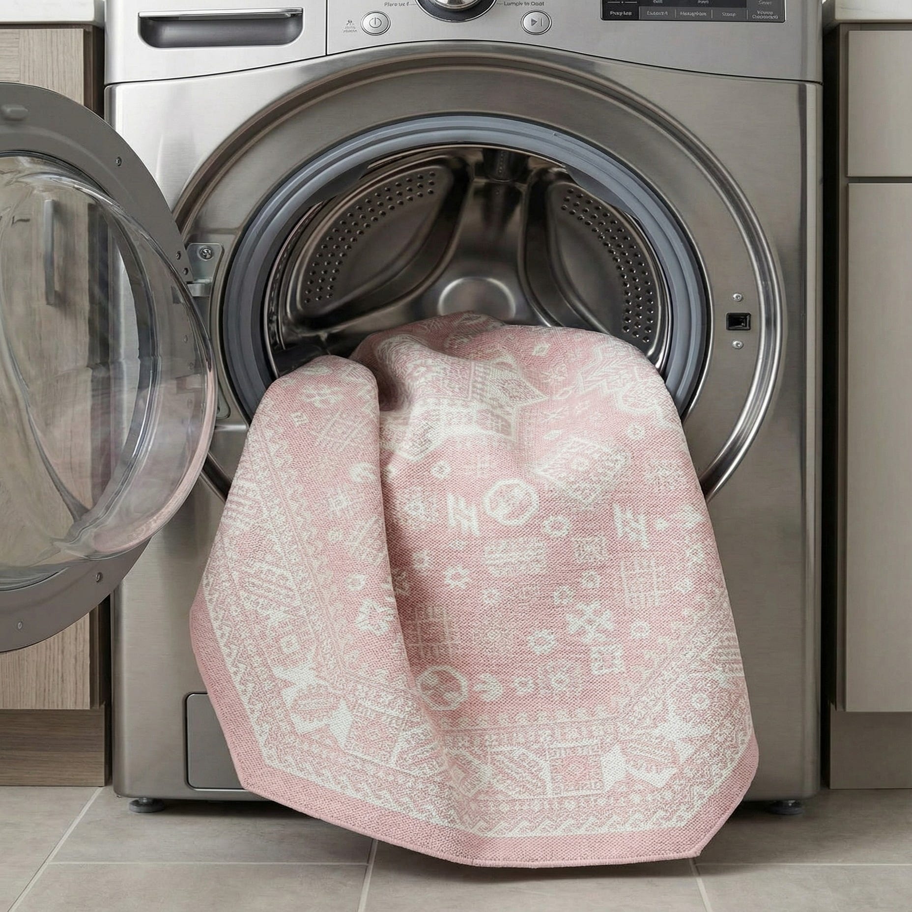 Primary color is Pink. Colors in this rug include: Pink, Ivory.