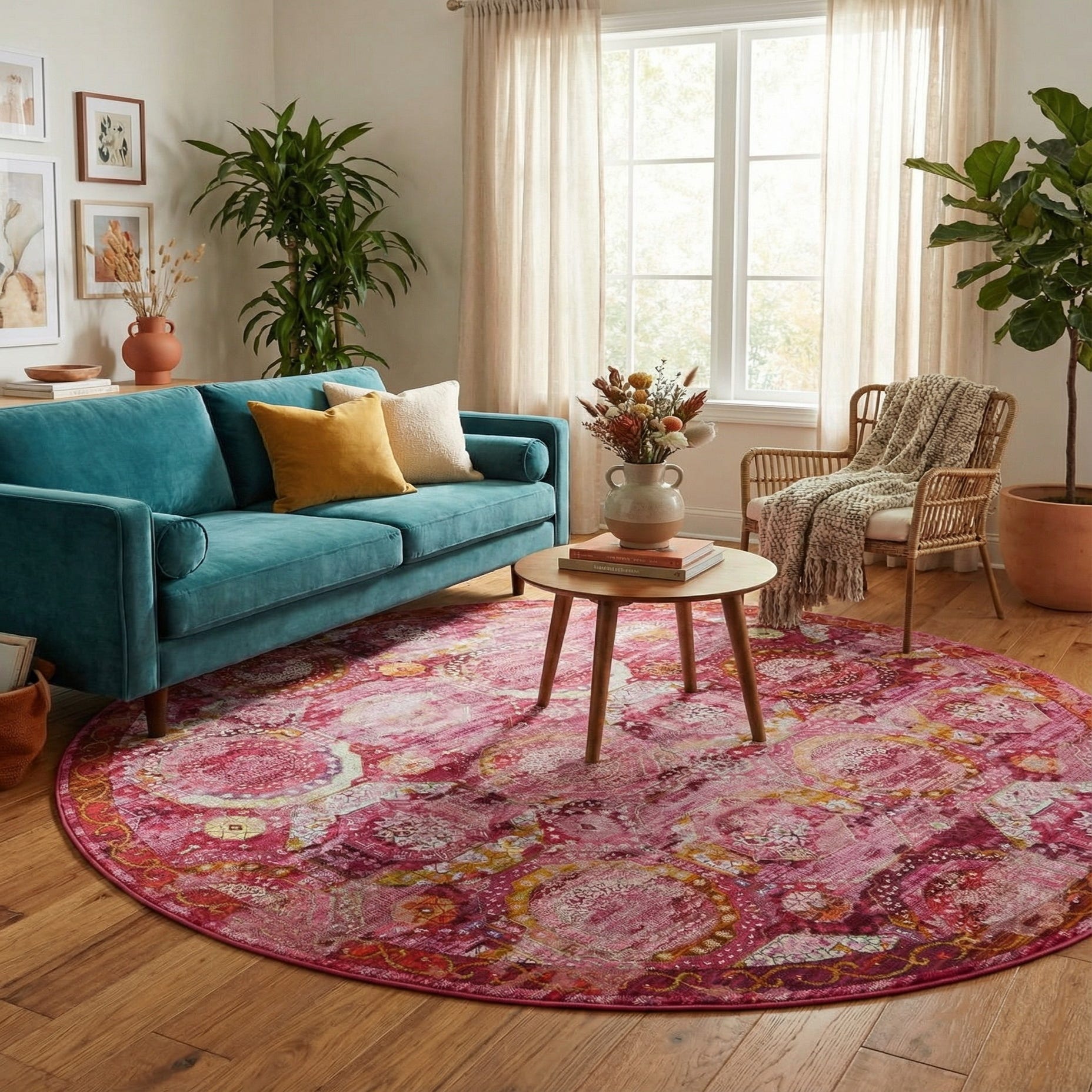 Primary color is Pink. Colors in this rug include: Pink, Burgundy, Ivory, Olive, Orange, Purple, Red.