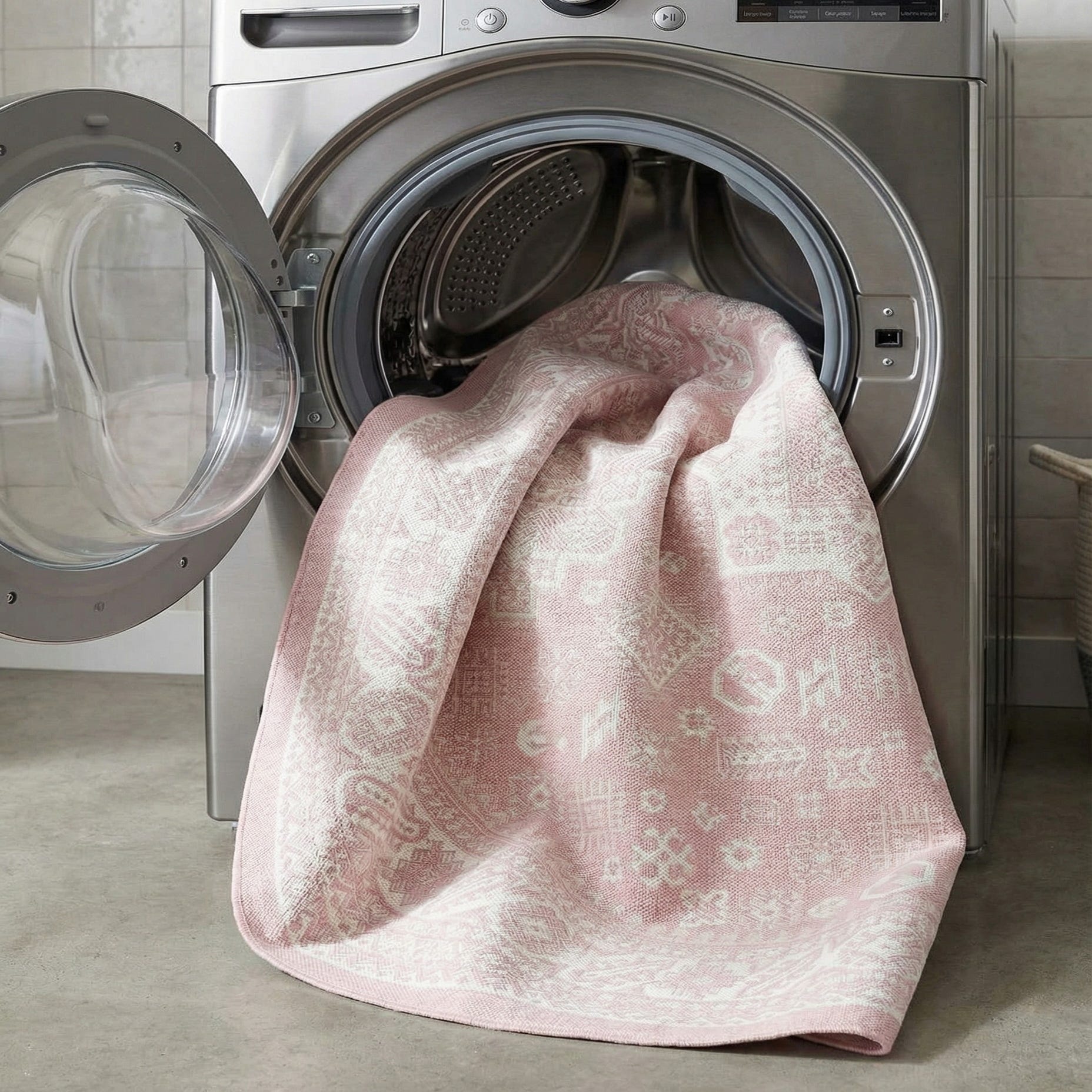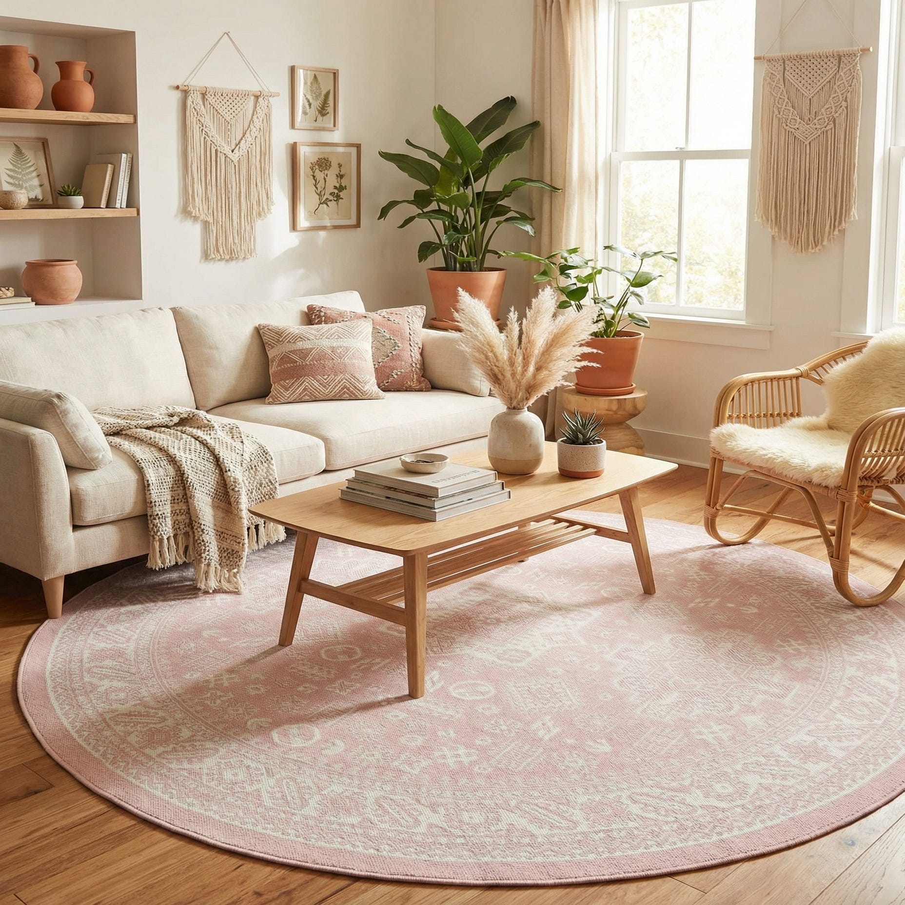 Primary color is Pink. Colors in this rug include: Pink, Ivory.