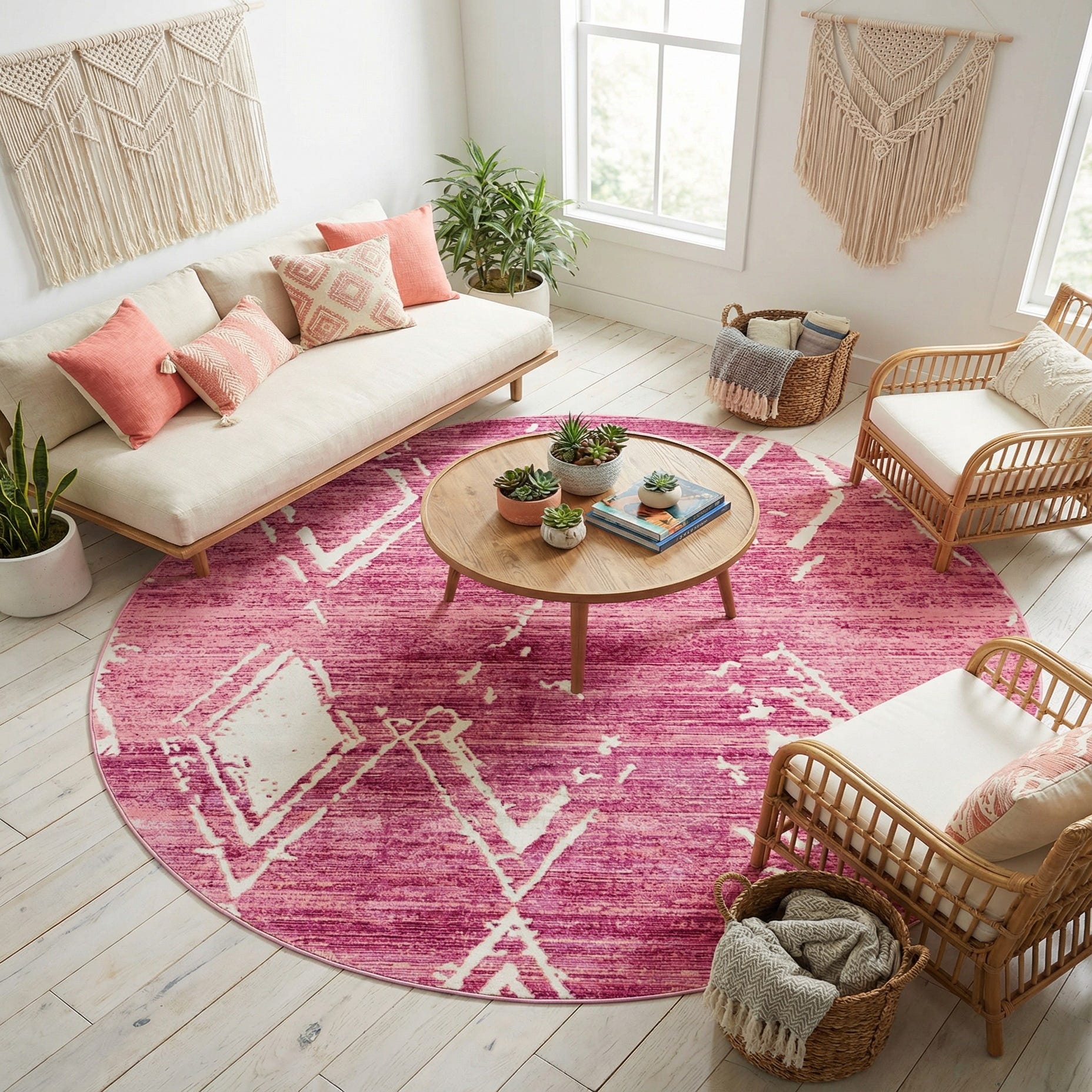 Primary color is Pink. Colors in this rug include: Pink, Ivory.