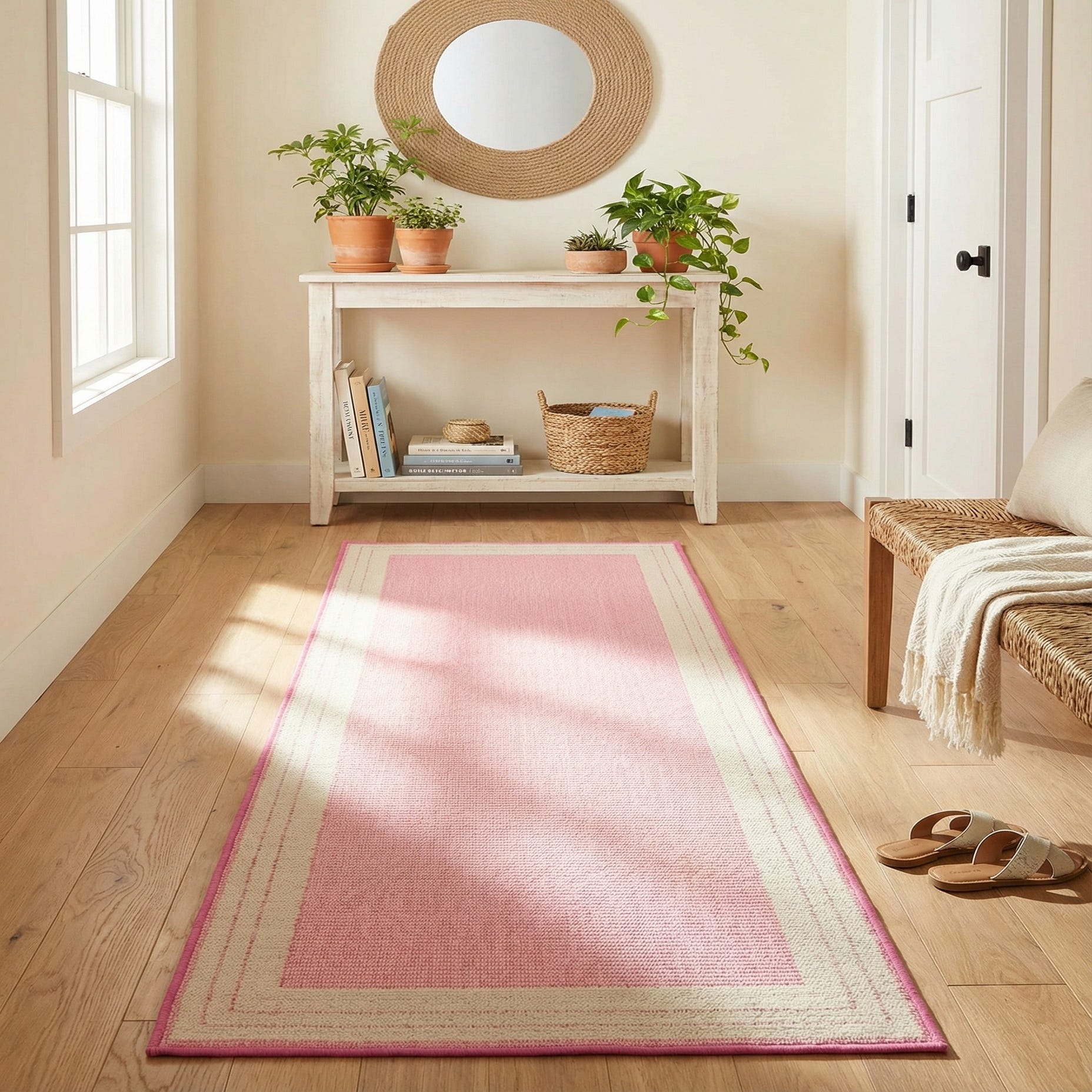 Primary color is Pink. Colors in this rug include: Pink, Ivory.