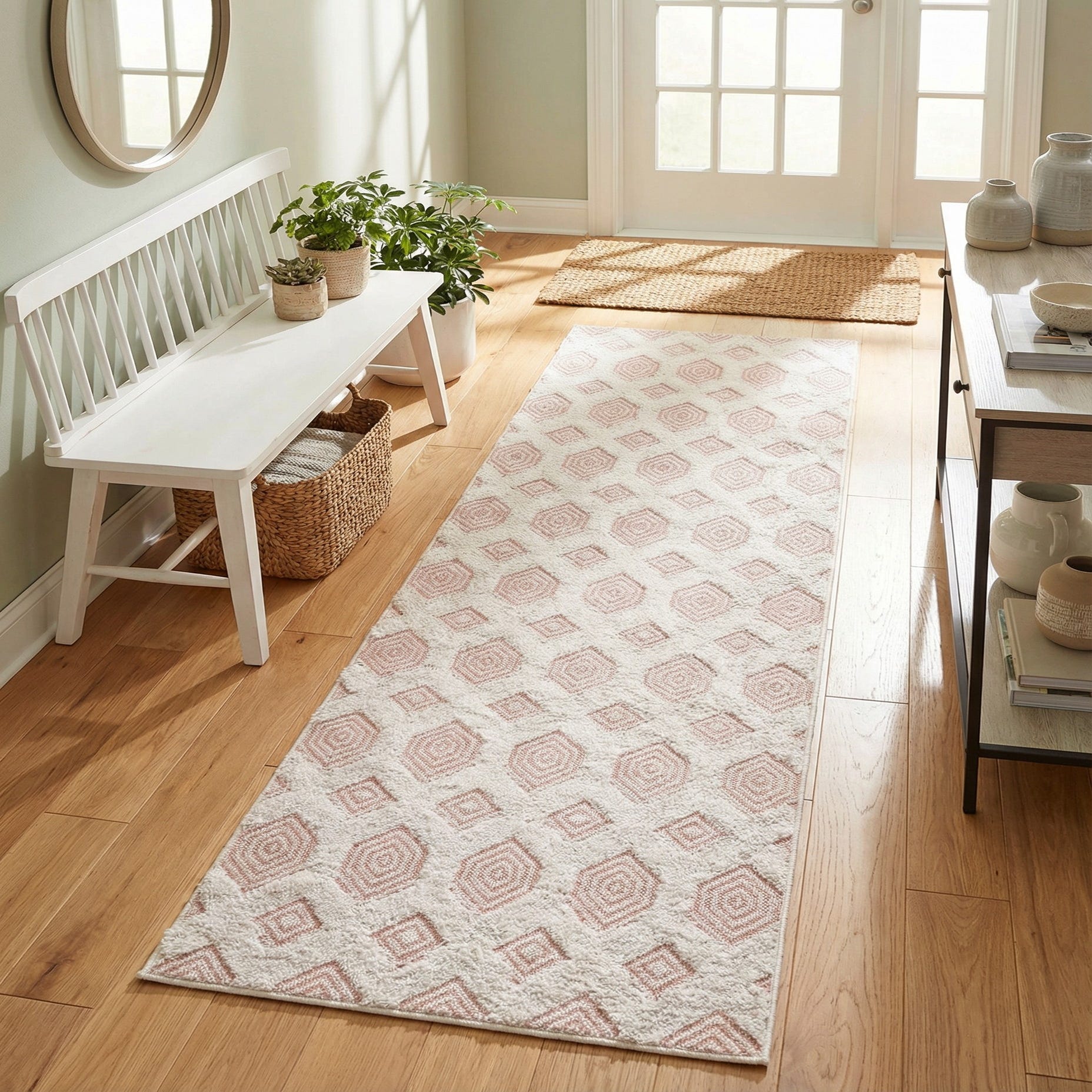 Primary color is Pink. Colors in this rug include: Pink, Ivory.