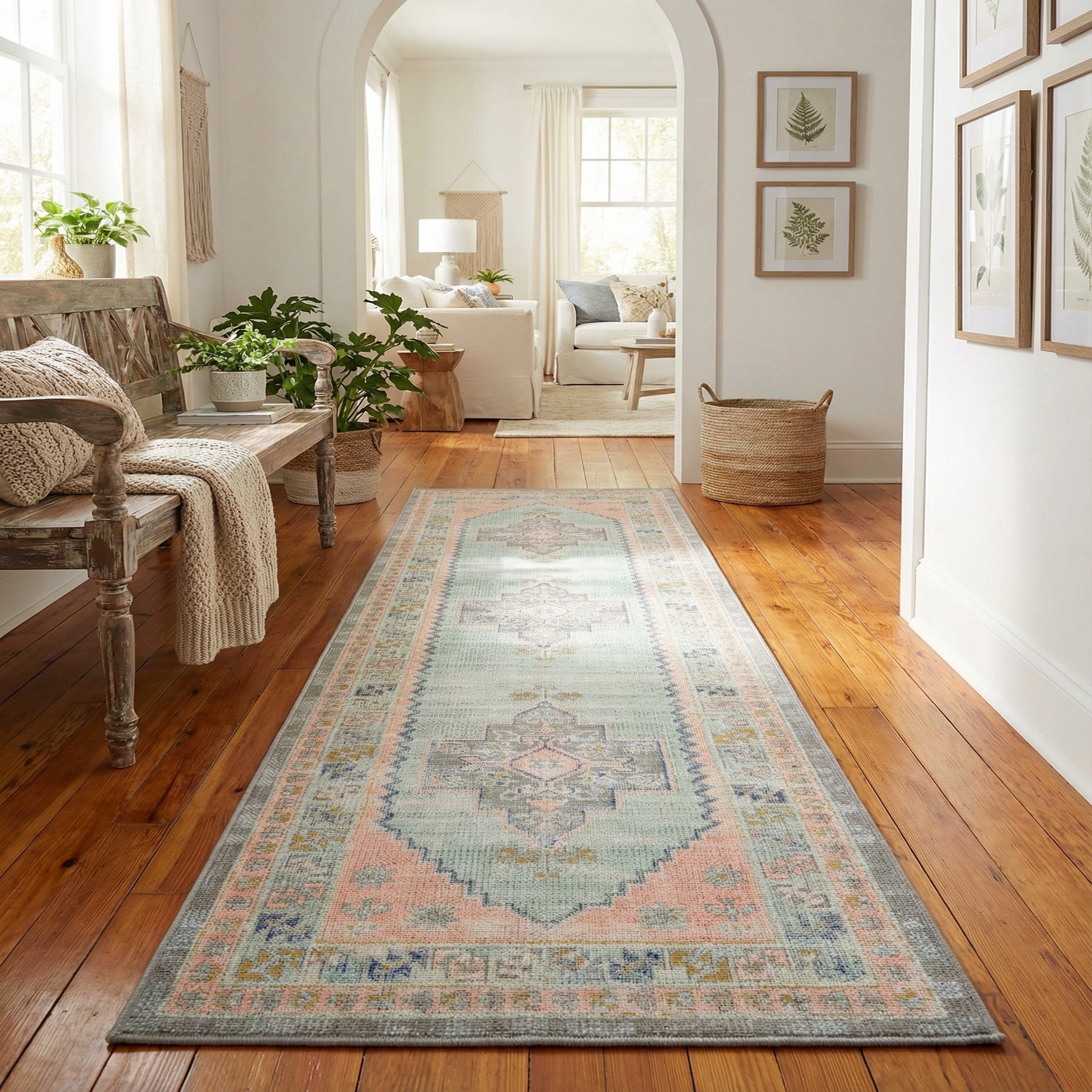 Primary color is Pink. Colors in this rug include: Pink, Blue, Gold, Gray, Light Green, Light Blue.