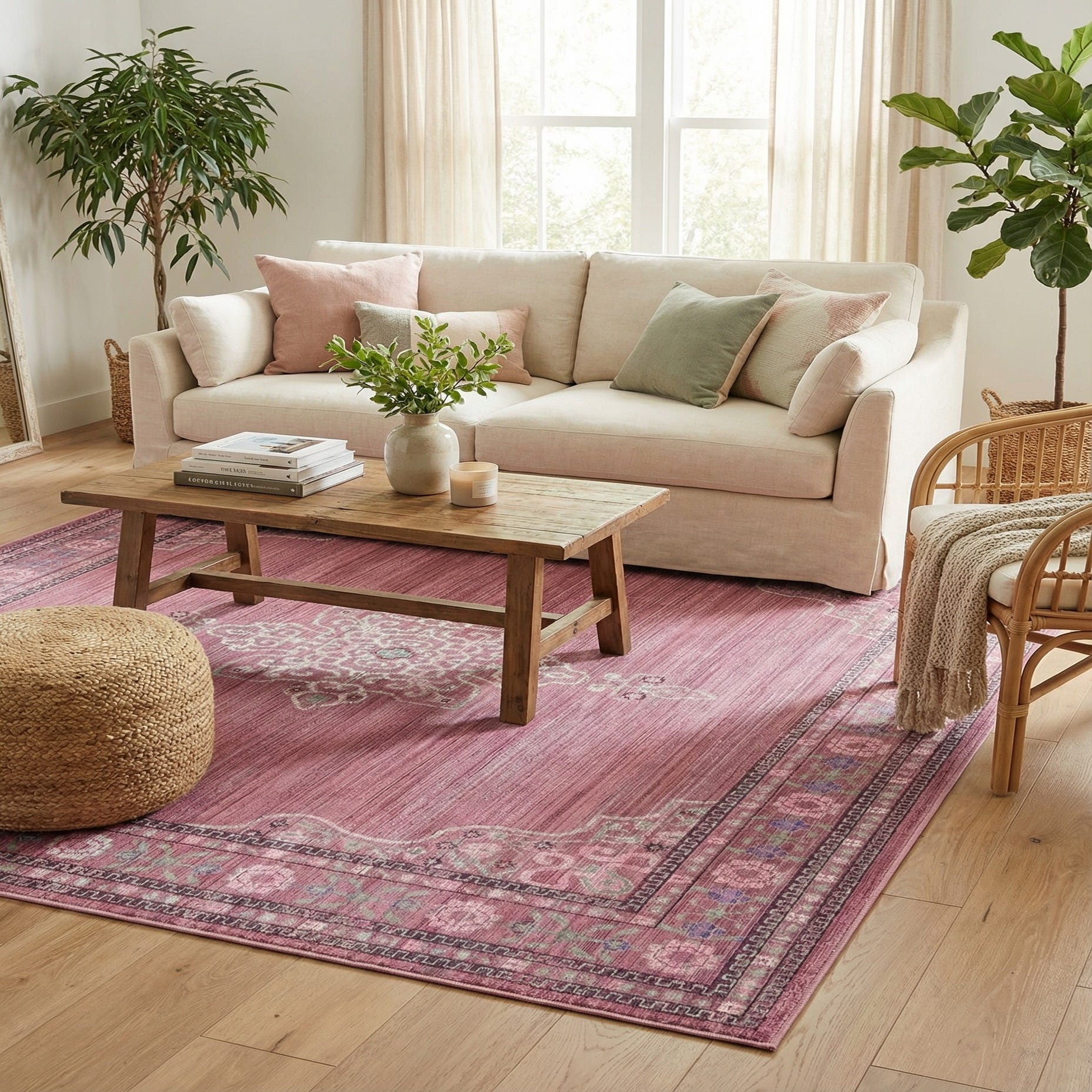 Primary color is Pink. Colors in this rug include: Pink, Beige, Gray, Maroon, Purple.