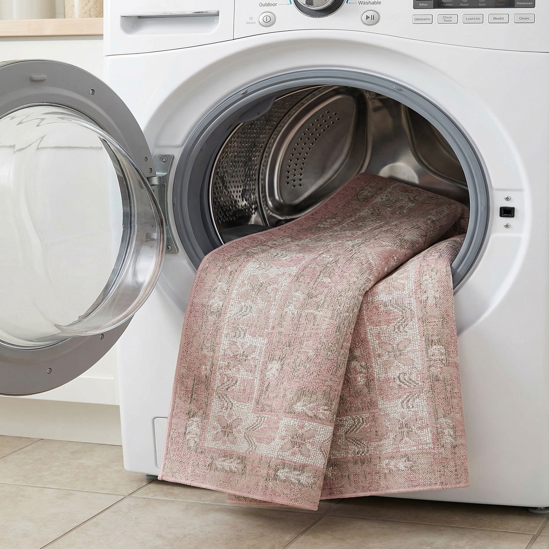 Primary color is Pink. Colors in this rug include: Pink, Gray.