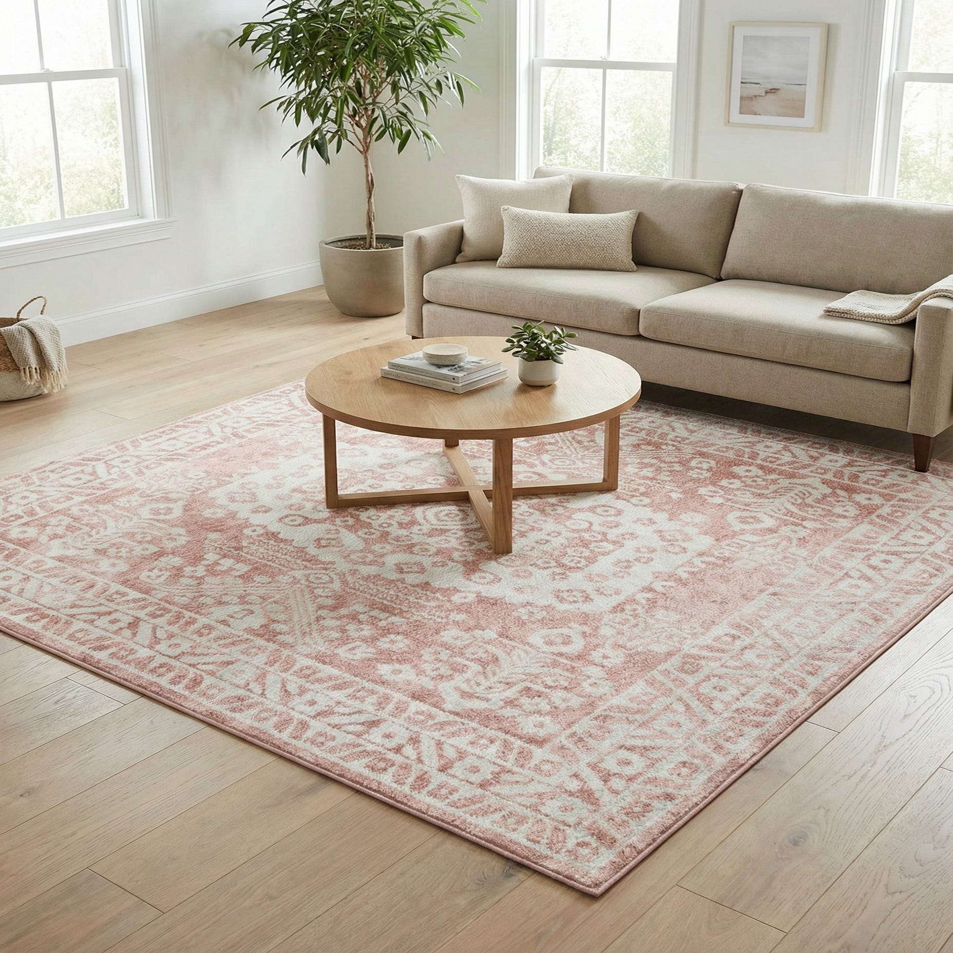 Primary color is Pink. Colors in this rug include: Pink, Ivory.